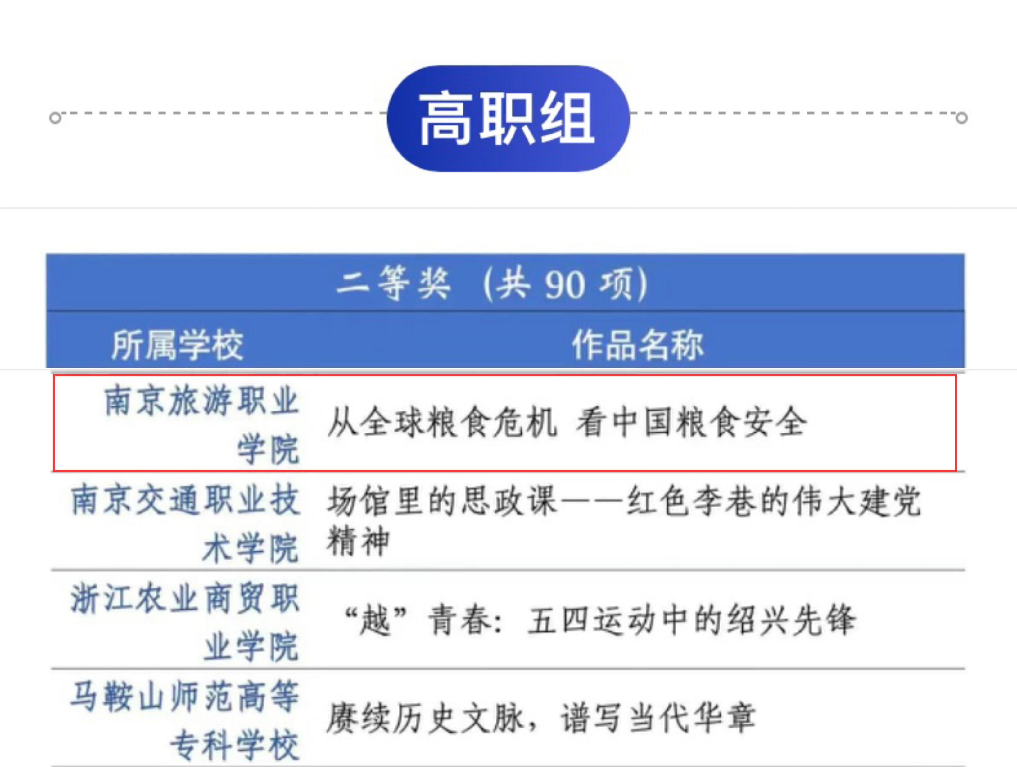 近日,由教育部办公厅开展的习近平新时代中国特色社会主义思想大学习领航计划主题教育活动——第七届全国高校大学生讲思政课公开课展示活动评审结果揭晓,我院参赛作品《从全球粮食危机看中国粮食安全》荣获二等奖,该参赛作品由周乐萱、沈慧婷两位学生主讲,马克思主义学院青年教师蒯金娜、关玉瑞参与指导。