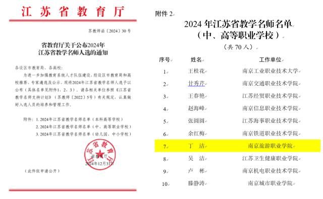 近日,江苏省教育厅发布《关于公布2024年江苏省教学名师人选的通知》,旅游管理学院丁洁教授成功入选。