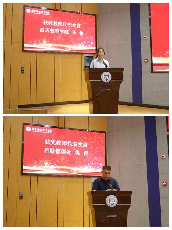 酒店管理学院教师肖伟和后勤管理处副处长仇涛分别作为优秀教师和管理服务人员代表发言,他们表示,感谢学校为他们提供了前所未有的职业环境和广阔发展空间,未来将不断提高教学和管理水平,为学生、学校和社会做出更大贡献。