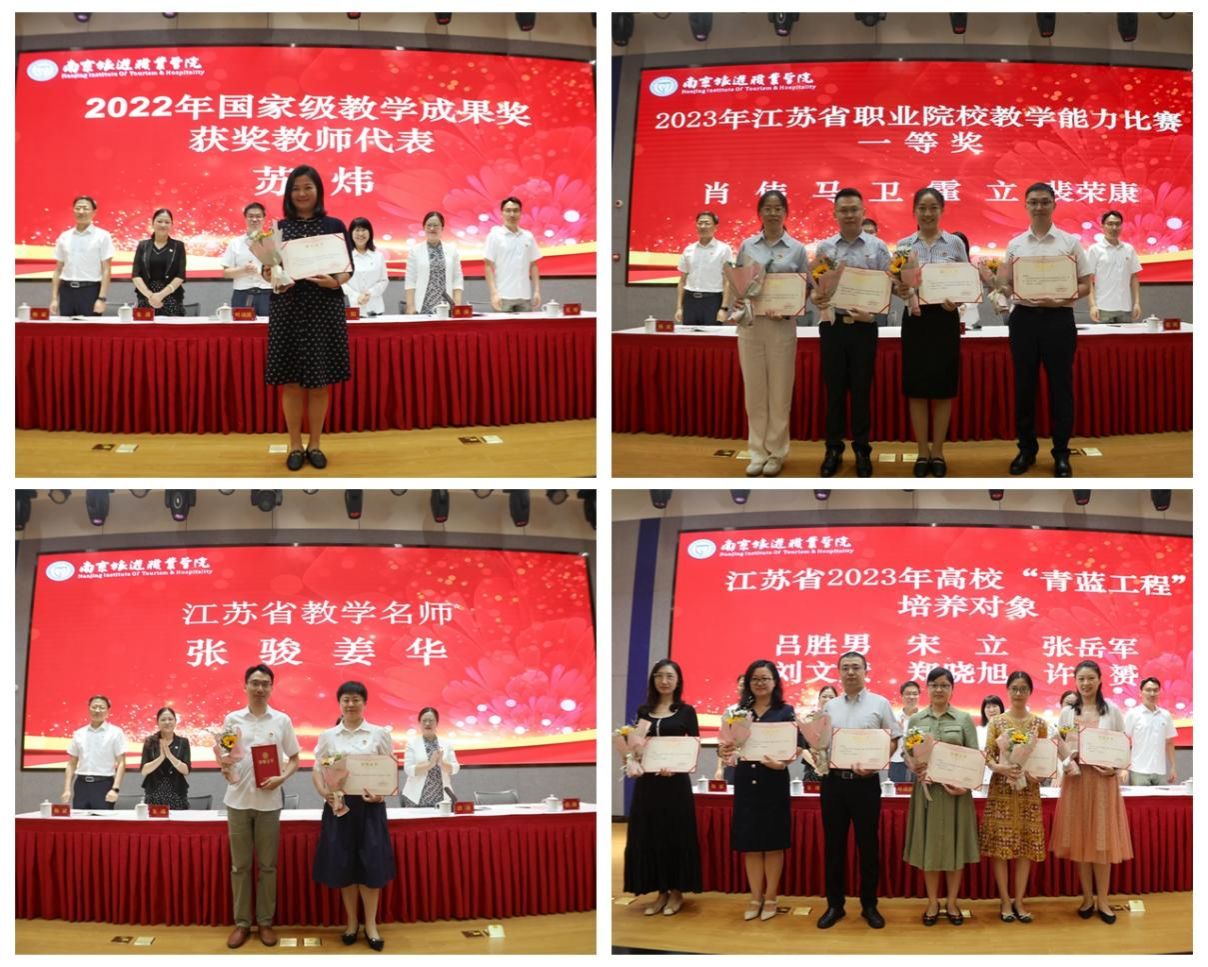 洪涛宣读受表彰教师名单,学院领导为在2022年国家级教学成果奖评选、2023年江苏省职业院校教学能力比赛、2023年全国职业院校技能大赛、2023年中国烹饪协会“功勋人物奖”评选、2023年全国饭店业职业技能竞赛、江苏省高校教师基本功展示、江苏省职业院校技能大赛、江苏省高校就业创业指导教师教学技能大赛、江苏省青少年高尔夫球锦标赛以及团学和管理服务等工作中获得表彰的教师和团队进行现场颁奖。