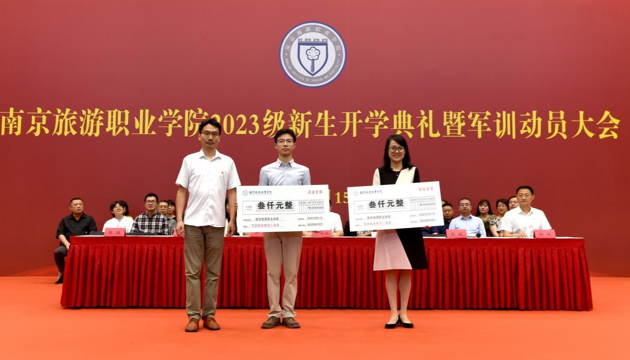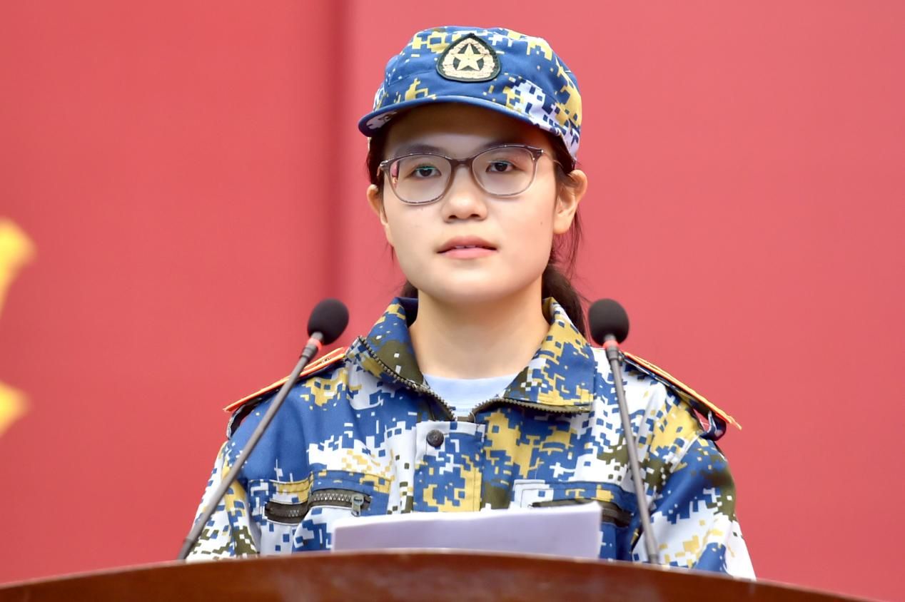 军训教官代表靳聪和23级旅游管理1班的朱珍蓁分别作为教官和新生代表发言。