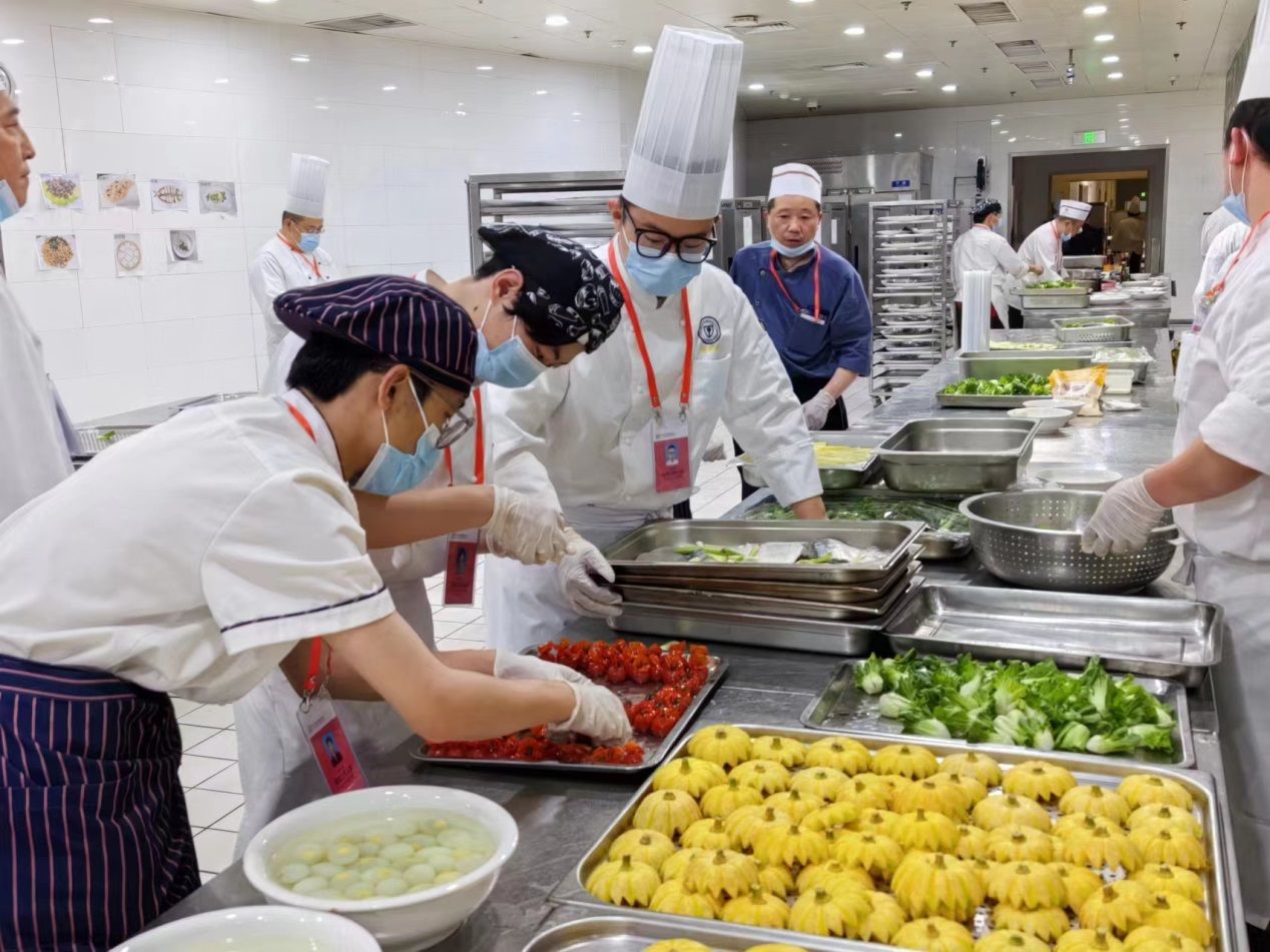 从曙光未现到明月高悬,江苏发展大会筹备及举行期间,烹饪与营养学院的90余名志愿者每天都在紧张忙碌着。为协助金陵饭店、南京国际青年会议中心酒店、扬子江国际会议中心酒店高质量完成宴会餐饮制作,同学们将理论与实践相结合,用智慧和意志力打磨细节,从前菜、热菜、汤品、甜品到饭后水果,力求每一个环节都完美无缺,为五湖四海的游子呈现“家的味道”。