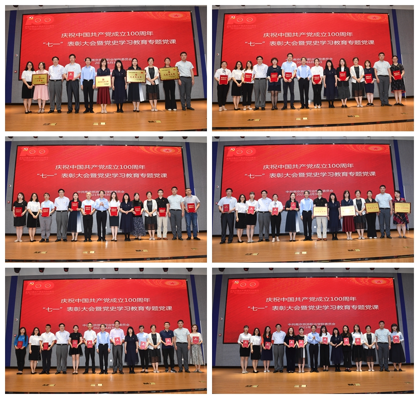 黄斌宣读了《省委教育工委关于公布江苏高校特色党支部评选结果的通知》《省委教育工委关于公布江苏高校2019——2020年度党建工作创新奖和2020年度最佳党日活动优胜奖评选结果的通知》《中共江苏省文化和旅游厅党组关于表彰优秀共产党员、优秀党务工作者、先进党支部的决定》以及《南京旅游职业学院关于2020年度“两优一先”和最佳党日活动等评选表彰的决定》,院领导为获得省级和校级荣誉的先进集体和个人颁奖。
