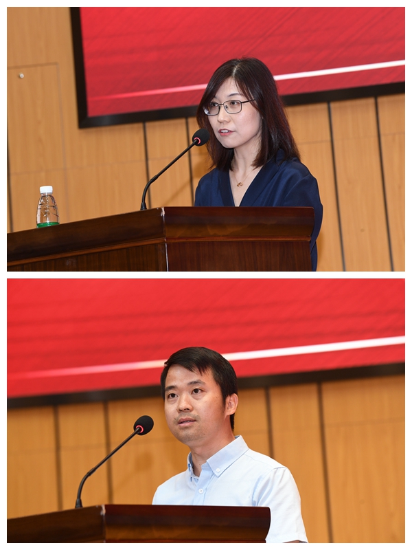 会上,人文艺术学院教工党支部书记牛小丽和旅游外语学院党员教师王叶丁分别代表获奖先进集体和个人在大会上作交流发言。
