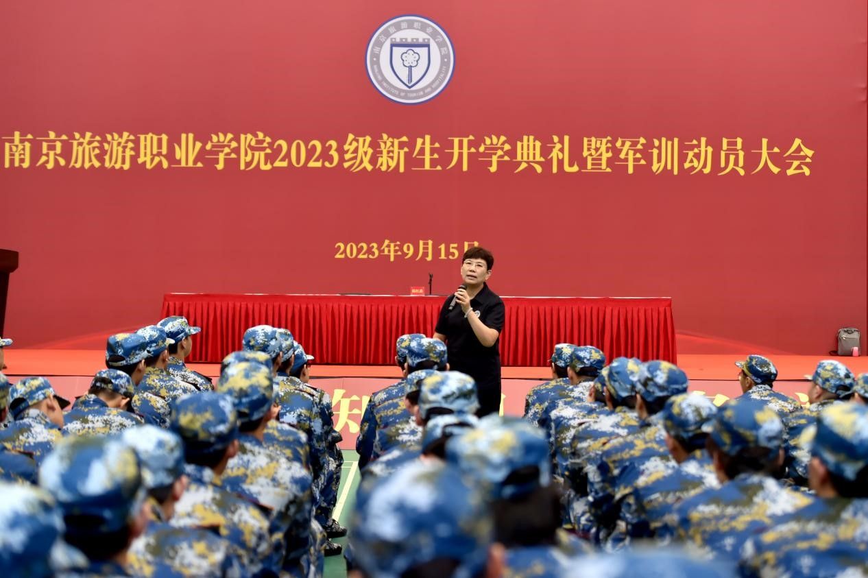 9月15日上午,南京旅游职业学院开学典礼暨军训动员大会在庄严的国歌声中拉开帷幕,来自全国19个省、市、自治区的2558名新同学迎来了一场别开生面的欢迎仪式。学院党委书记叶凌波,党委副书记、院长操阳,军训承训部队武警某部保障处处长尹颖,党委副书记朱琰,副院长洪涛、杨斌、张骏,学院各职能部门、二级学院主要负责人,全体军训教官,2023级新生及其辅导员和班主任一同出席大会。