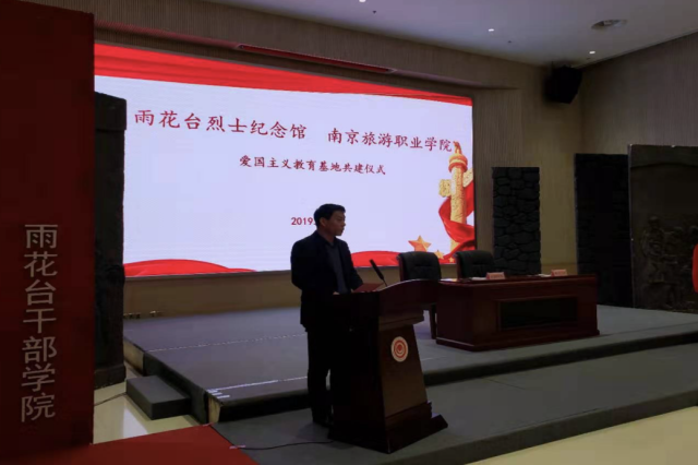 爱国主义教育基地共建仪式在威严神圣的国歌声中拉开了序幕,方国中副局长在仪式中致辞,他指出,雨花台是中国新民主主义革命的纪念圣地、全国首批爱国主义教育示范基地、全国廉政教育基地。雨花先烈们崇高的理想信念,高尚的道德情操,为民牺牲的大无畏精神,是进行理想信念教育、革命传统教育的生动教材,是不竭的精神动力和力量源泉。雨花台烈士陵园作为全国著名的爱国主义教育示范基地,有着深厚的红色文化底蕴以及许多感人至深的革命故事。未来,雨花台烈士陵园将积极发挥红色教育功能,创新思想政治教育载体,与南京旅游职业学院携手,共同提升和促进爱国主义教育工作的开展。