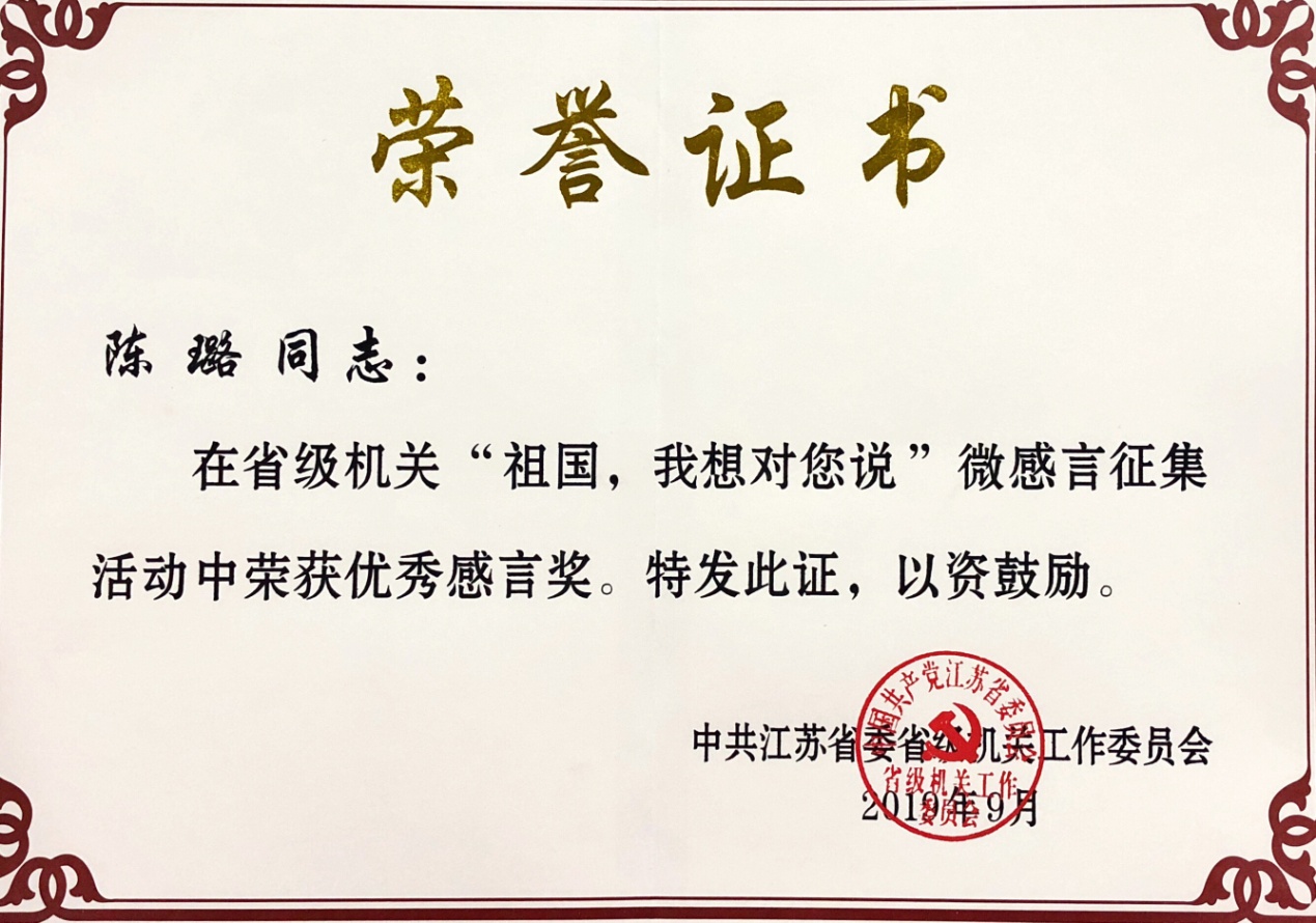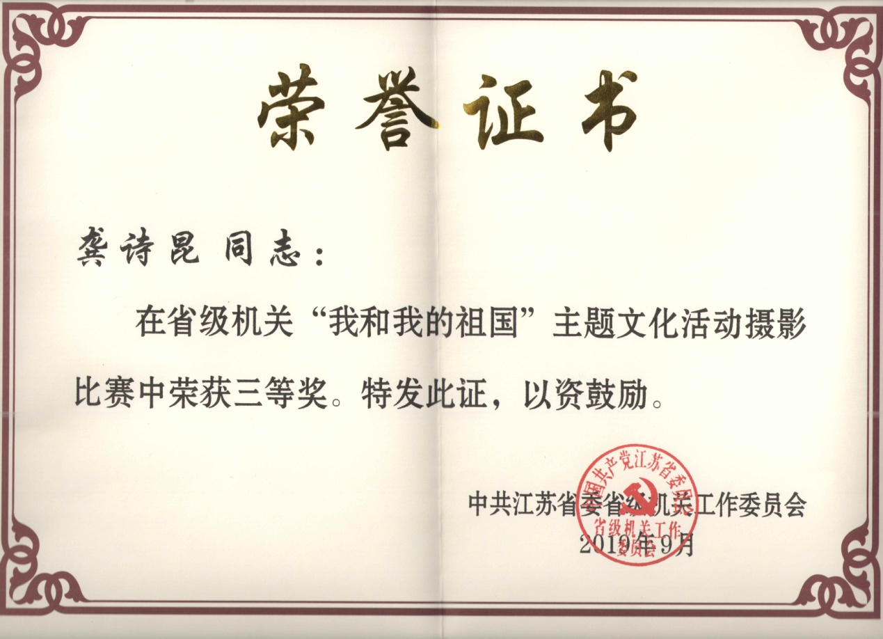 为庆祝中华人民共和国成立70周年,从2019年5月起,省级机关工委组织开展了“我和我的祖国”主题文化活动。接省文化和旅游厅通知后,我院党委宣传部积极组织动员广大党员干部和教职工参加,取得了优异的成绩。经省级机关工委评选,我院廉亚威老师获主题文化活动美术比赛特别奖,龚诗昆老师获摄影比赛三等奖,陈璐老师获微感言征集优秀感言奖,充分展示了我院干部职工积极向上的精神风貌和强烈的爱国热情。