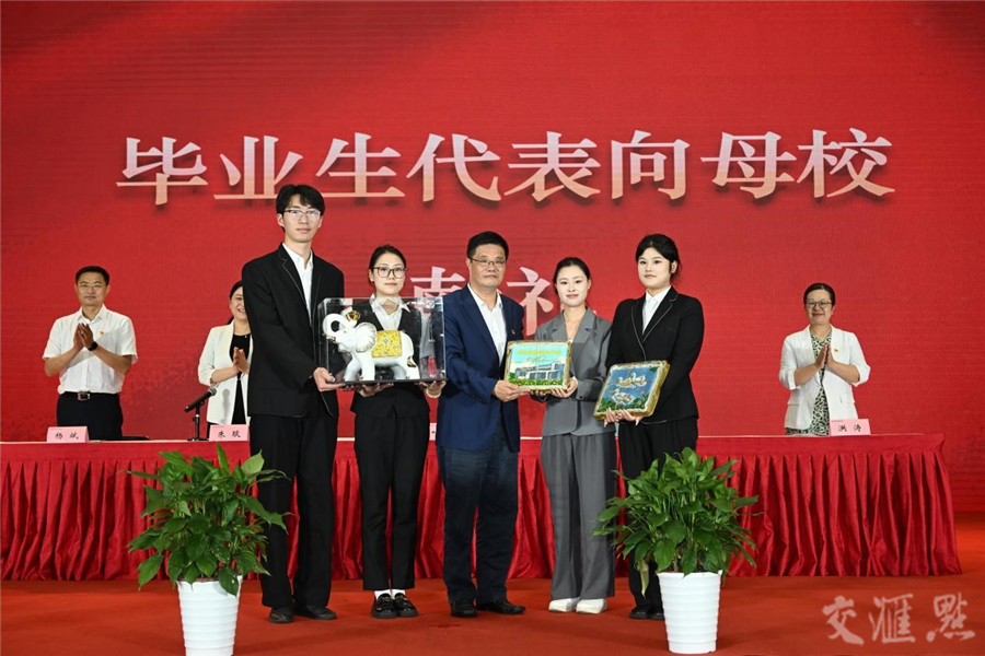 党委书记叶凌波代表学院接受酒店管理学院学生代表全体毕业生赠送的感恩母校纪念品。