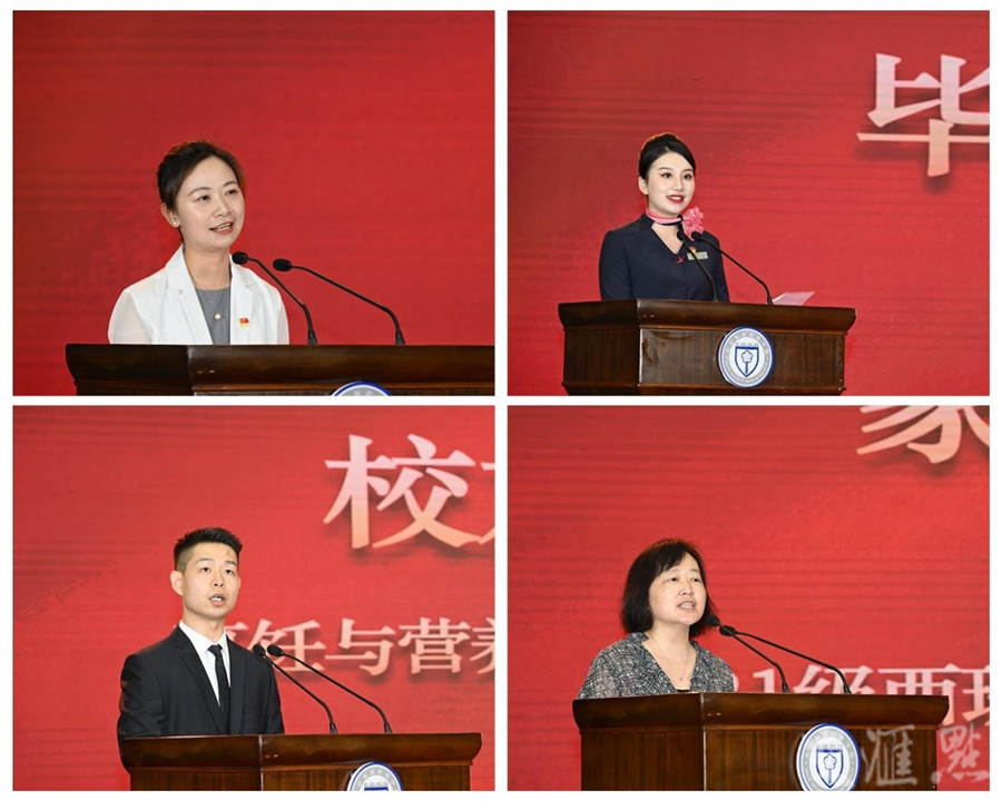 毕业生代表霍智俐、教师代表刘寒雨、校友代表伏静轩和毕业生家长代表王琴分别发言。在毕业典礼上,学院专门安排了毕业生为家长、老师、辅导员、保安、食堂师傅和宿管阿姨等送上感恩之花,感谢他们在每一个看得见或看不见的岗位上用心守护校园与学子们的每个日夜。