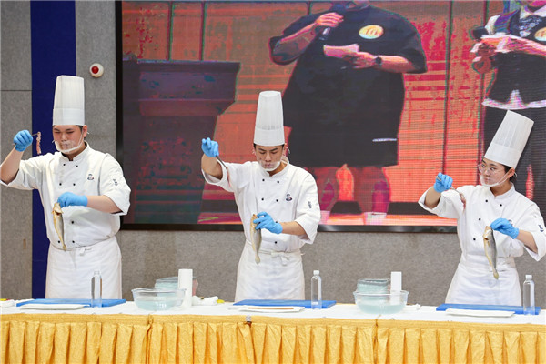 烹饪与营养学院学生现场表演黄鱼拆骨,靠的就是“熟能生巧”。“黄鱼拆骨要求平常要多练,要知道骨头和鱼肉之间的结构,快速下刀的准确度,把握的力度是非常重要的。”江苏省产业教授、江苏省餐饮行业协会名厨专委会主席、金陵饭店食品研发中心主任孙学武,对同学们的表演进行了点评。