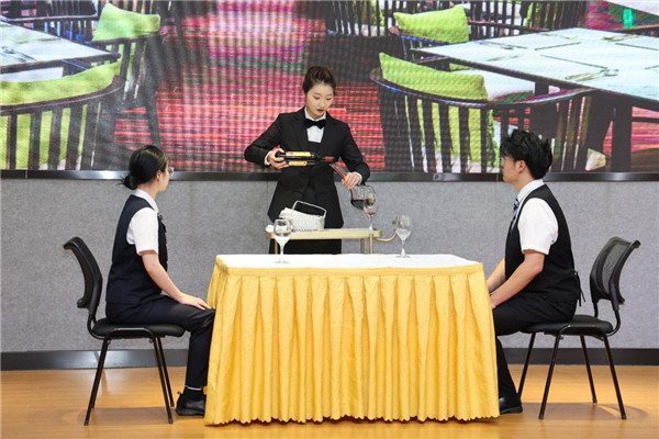各二级学院展示了参赛成果。在2023年全国职业院校技能大赛中,酒店管理学院团队获得新设立的“酒水服务”赛项一等奖,“酒水盲品”是比赛项目之一。“葡萄品种是长相思,来自智利中央山谷,年份是2021年。”看一眼、闻一下、抿一口,酒水服务赛项指导教师曾祺尧就判断出了葡萄酒的品种、产地和年份,“在技能大赛的训练过程当中,我们的选手每天不停地去品尝不同产区不同年份的葡萄酒,准备了6个月的时间。”