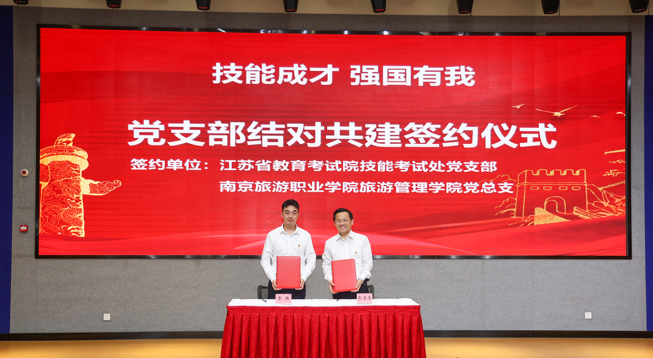 随后,田园餐饮技能创新大师工作室、顾至欣数字文旅营销大师工作室、陆少凤技能大师工作室、高志斌智能烹饪技能大师工作室、刘伟烘焙技能大师工作室举行授牌仪式;江苏省教育考试院技能考试处党支部与南京旅游职业学院旅游管理学院党总支举行了结对共建签约仪式。