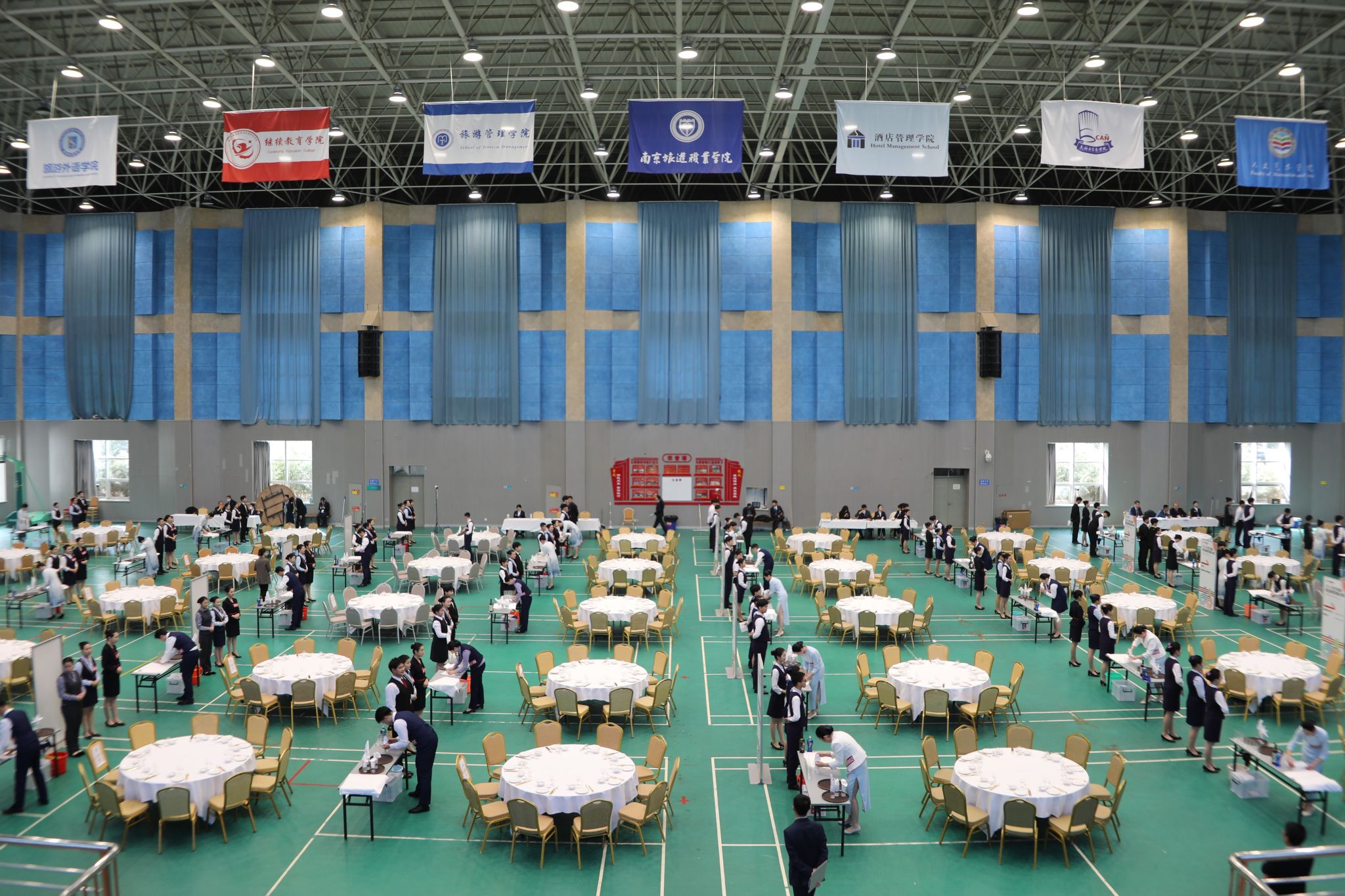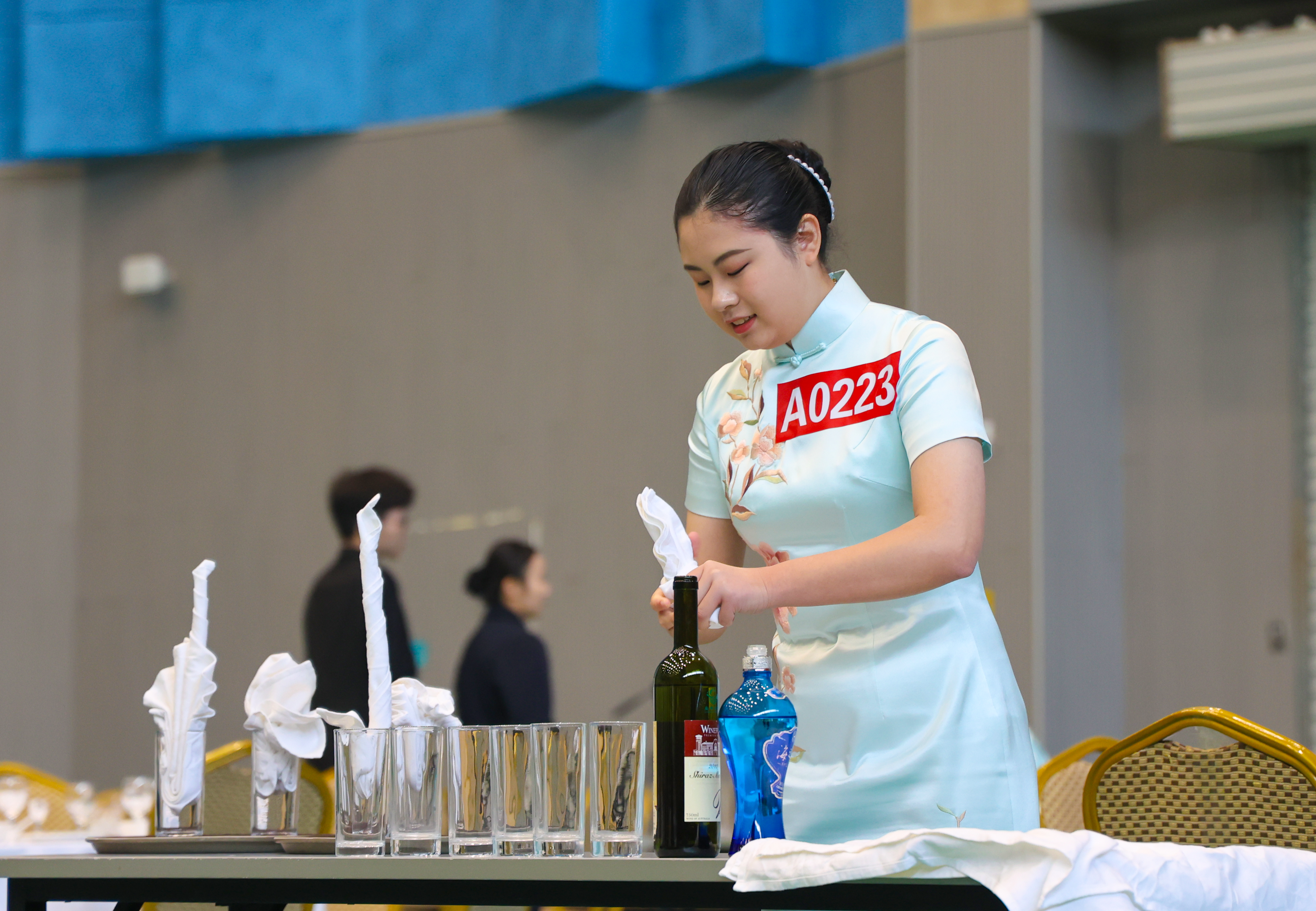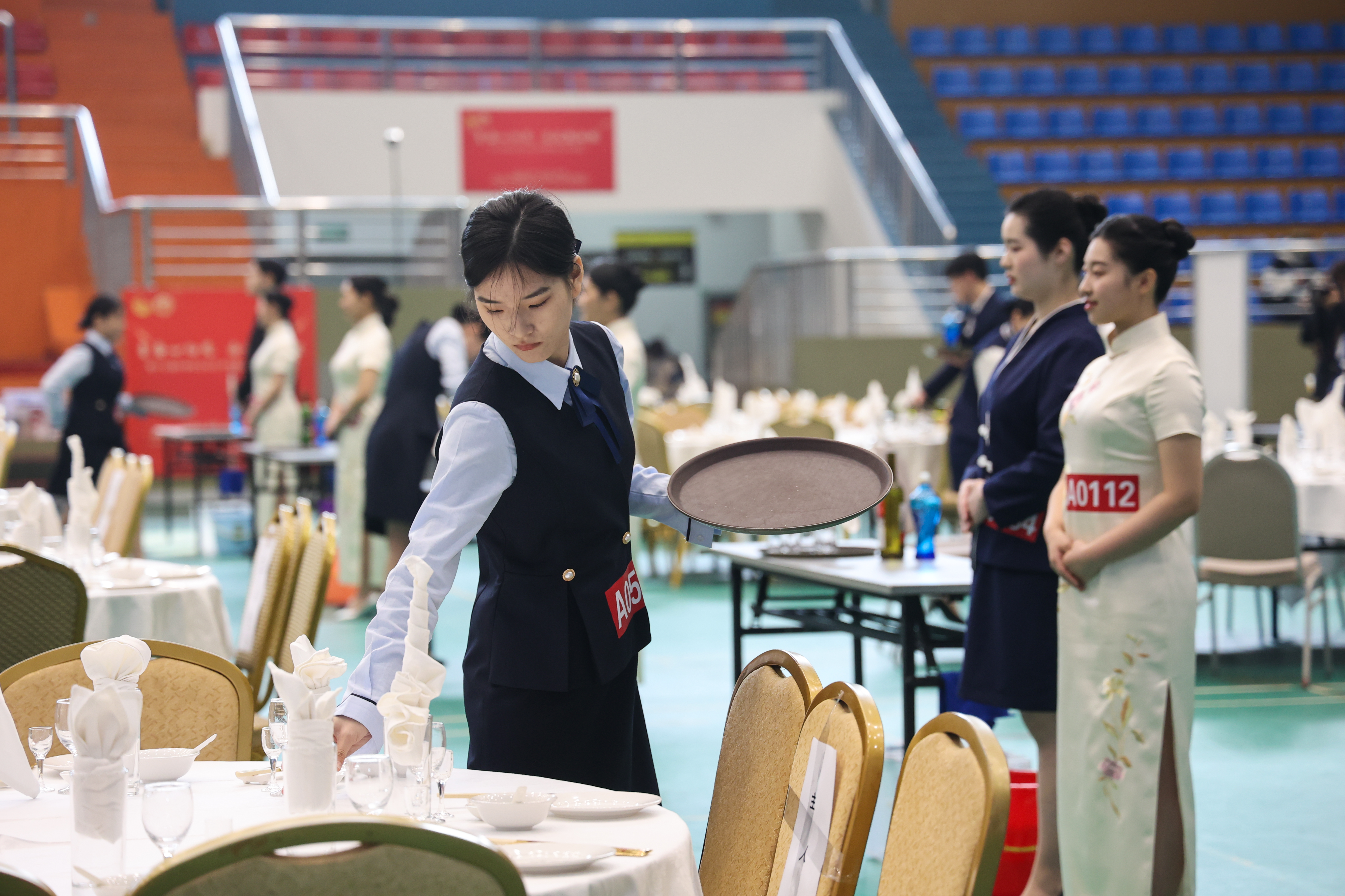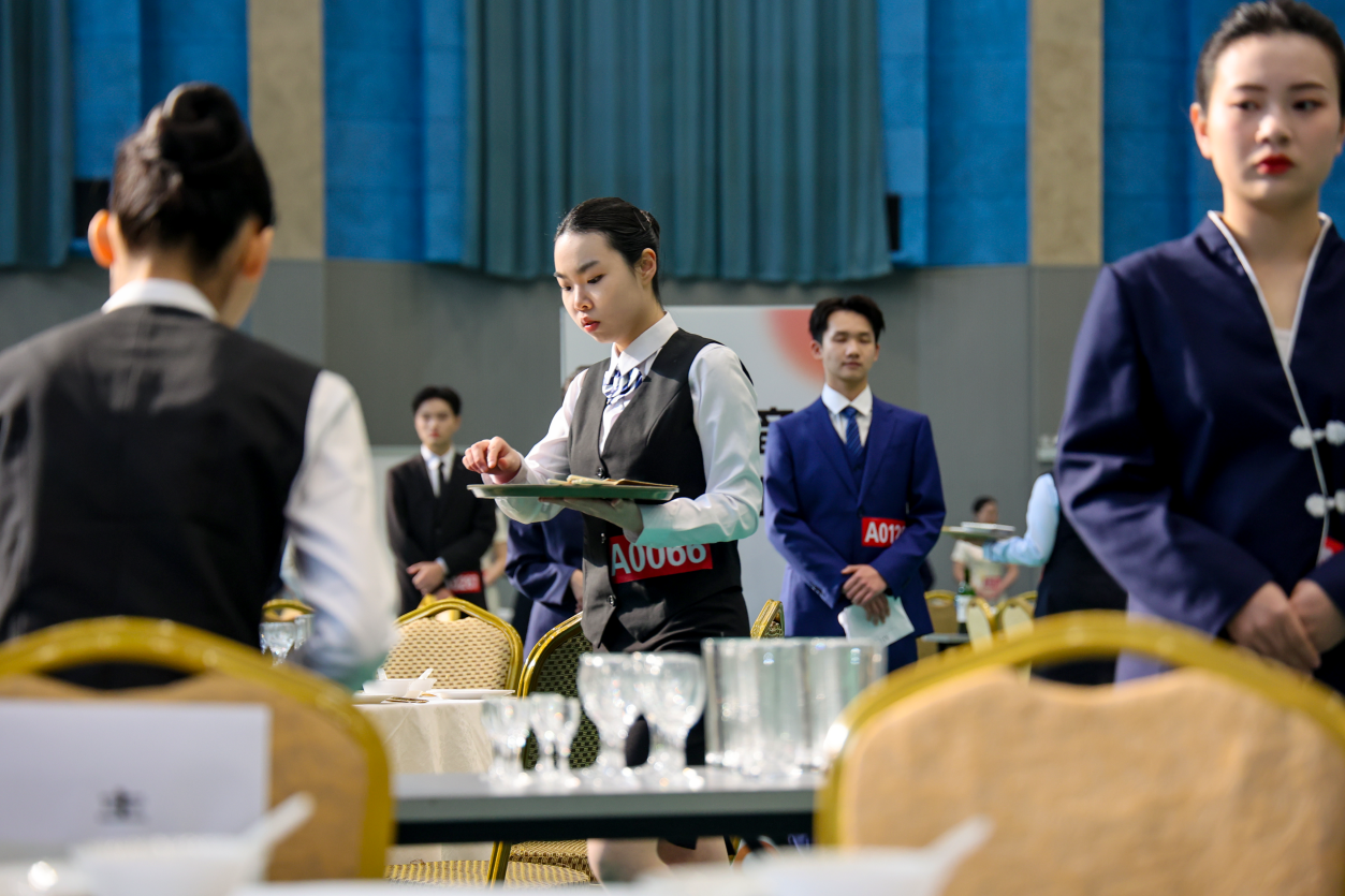 以中餐宴会摆台项目为例,考生要在15分钟内,完成餐前准备、铺台布、骨碟定位、拉椅、汤碗勺、味碟、筷架摆放、摆三杯、折花、托盘斟酒等多项操作,同时还要注重自身仪表姿态。