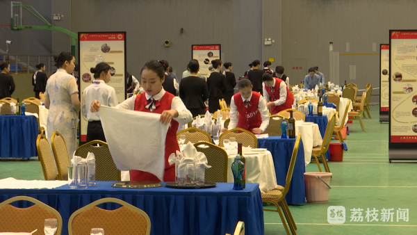 中餐宴会摆台项目,考生要在规定时间内完成餐前准备、铺台布、骨碟定位、拉椅、摆三杯、折花、托盘斟酒等多项操作,同时还要注重自身仪表姿态。
