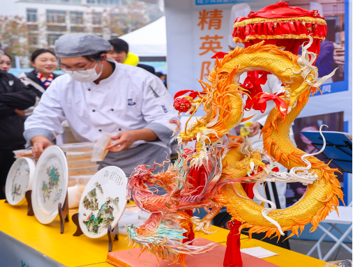 走进长江流域江苏段美食文化节,50家学生创业店铺汇聚长江流域江苏八大城市美食板块,从南京金陵菜到苏州的松鼠桂鱼,从无锡小笼包、南通的炒文蛤到泰州的蟹黄汤包等美食,每一味都是江苏饮食文化的璀璨明珠;食育与营养社团打造的“运养阁”,其将营养健康与现代科技有机融合;食俗体验区,从金陵方糕的甜蜜吉祥,到豆花的团聚温情,再到打麦场的质朴丰收,让师生们通过美食深刻感受地域文化的独特魅力;校企合作板块、技能大师工作室分别聚焦于智能烹饪、中式烹饪与烘焙相关技能研发,是深耕产教融合的体现;非遗美食板块,邀请了4位省级非遗传承人展示烹制技艺。