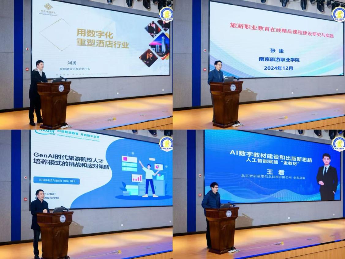 12月6日举行的“新质生产力驱动的旅游教育数字化转型与产教融合创新研讨会”上,学院党委委员、副院长张骏围绕“旅游职业教育在线精品课程建设研究与实践”,广州市问途信息技术有限公司董事长黄昕围绕“GenAi时代旅游院校人才培养模式的挑战和应对策略”,金陵酒店管理公司市场营销中心总经理刘勇围绕“用数字化重塑酒店行业”,北京智启蓝墨云信息技术有限公司业务总监王君围绕“Ai数字教材建设和出版新思路人工智能赋能金教材”的主题做了专题分享。圆桌论坛环节,由全国旅游行业指导委员会副主任、南京师范大学周春林教授主持,印圣网络科技有限公司总经理杨永彪、书香世家酒店集团运营总监金虹、凤悦酒店及度假村数智管理部总经理刘智浩、豪猪网络技术有限公司人力资源总监晏凝、南京旅游职业学院酒店管理学院院长孙爱民围绕“新质生产力赋能酒店产业发展及人才培养实践”主题分别从不同的视角进行了主题研讨。