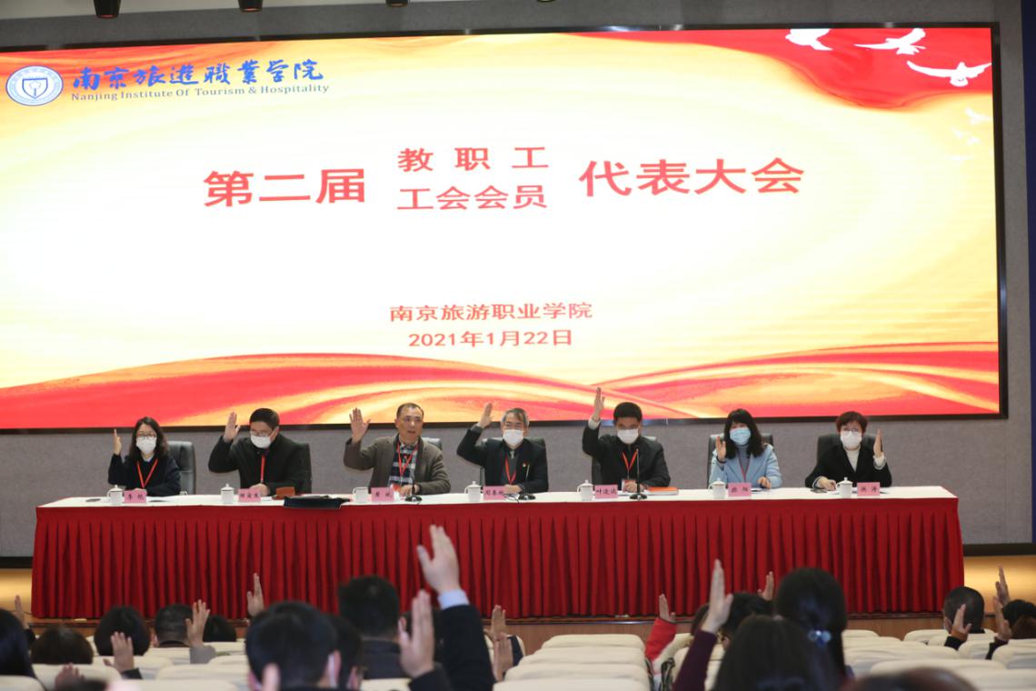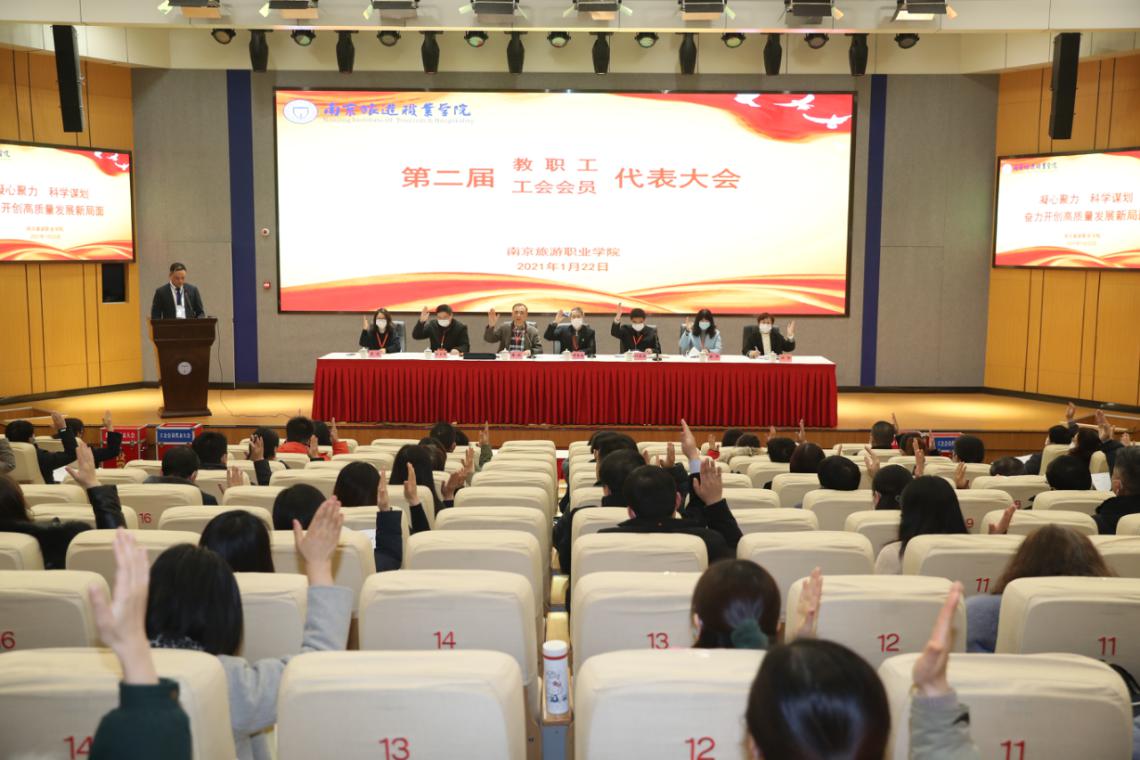 大会经过表决,一致通过了 《关于行政工作报告的决议(草案)》《关于第一届工会委员会工作报告的决议(草案)》《关于学院财务工作报告的决议(草案)》《关于工会经费审查报告的决议(草案)》《南京旅游职业学院教职工代表大会实施办法(审议稿)》以及《第二届教职工代表和工会会员代表大会决议》。