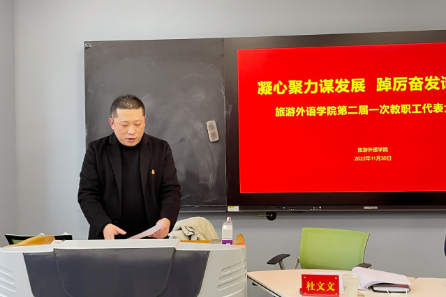 为了更好地发挥二级教代会的民主管理和民主监督作用,推进基层民主建设,保证教职工民主参与、民主管理和民主监督的权力,发挥教职工在学院各项工作稳步发展过程中的重要作用。11月30日下午,旅游外语学院第二届教职工代表大会第一次会议在教学楼3106智慧教室召开。学院党委副书记、副院长黄斌,旅游外语学院党政班子及全体教代会代表参加会议, 旅游外语学院分工会委员邢盖主持会议。
