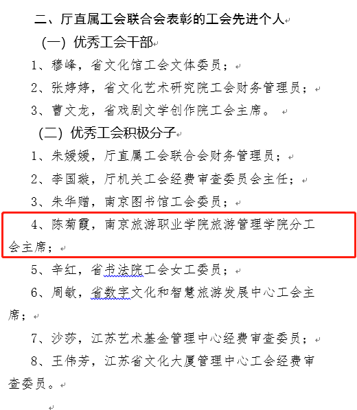 按照省直工会《关于开展2019—2020年度省直机关职工之家建设先进集体先进个人申报评选的通知》(苏委工直〔2020〕58号)要求,我院工会积极组织开展先进职工之家、先进职工小家和优秀工会积极分子的申报工作,经院党委同意、省文旅厅直属工会联合会推荐,受江苏省省直机关工会表彰,我院工会被评为“先进职工之家”;旅游管理学院分工会、酒店管理学院分工会、基础部分工会被评为“先进职工小家”;基础部分工会高立庆同志荣获“优秀工会积极分子”称号。旅游管理学院分工会陈菊霞同志受厅直属工会联合会表彰为“优秀工会积极分子”。