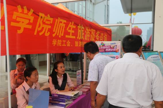 9月12日,在学院工会和旅游管理学院的共同努力下,我院与江苏省舜天海外旅游有限公司联合举办了针对我院师生的旅游服务咨询活动。这一天是来自全国各地2000多名新生报到的日子,也是旅行社旅游服务咨询活动首次走进我校校园。江苏舜天海外工作人员上午早早地在体育馆和图书馆门口搭起旅游服务咨询台,成为新生报到日的一隅亮丽风景线。参与服务的10名工作人员中有5名是我院毕业生,为期一天的旅游服务咨询活动给师生留下了深刻的印象,也提供了切实的旅游咨询服务。