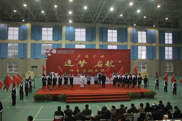 岁月更迭,万物在瑟瑟寒冬后悄然复苏;光阴渲染,音符在缤纷花雨里缀成乐章。2013年12月25日下午,由我院工会、学生工作部(处)、团委主办的“追梦•启航” 2014师生迎新大联欢活动在体育馆隆重举行。