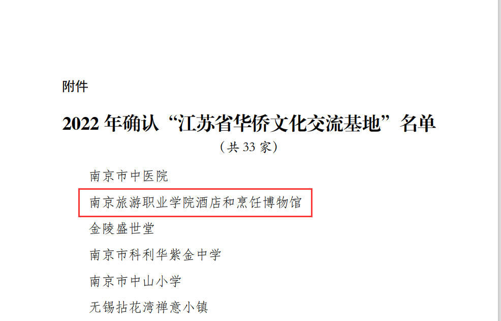 根据《江苏省华侨文化交流基地管理办法》,经专家评审、省侨联主席办公会议审定,我校酒店和烹饪博物馆被评为“江苏省华侨文化交流基地”。