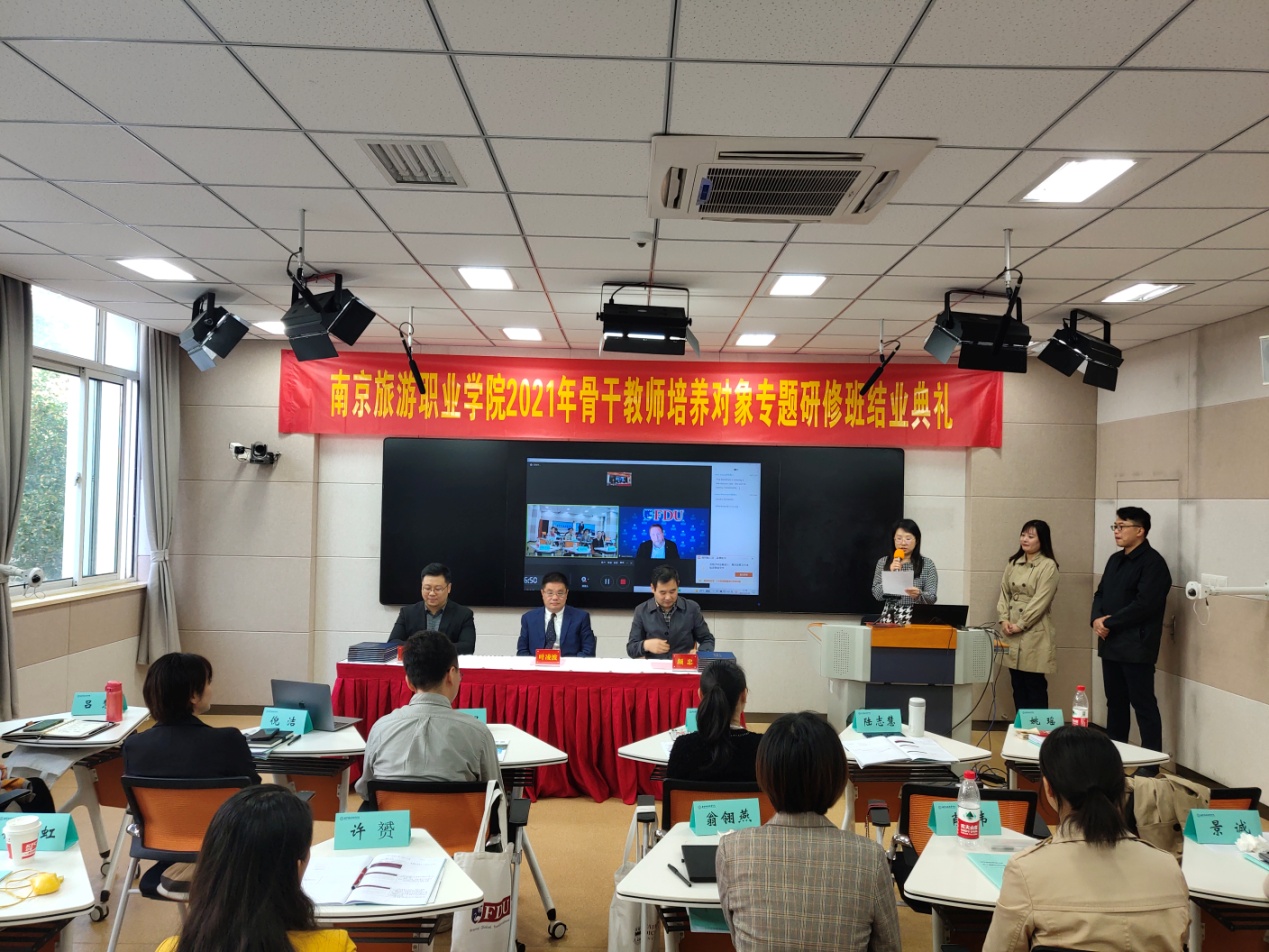 2021年10月30日,南京旅游职业学院和美国费尔利迪金森大学联合举办的2021年骨干教师培养对象专题研修班在智慧教室举行结业仪式。学院党委副书记、院长叶凌波,国际交流合作处处长颜忠,美国费尔利迪金森大学副校长、国际事务负责人Jason A. Scorza,南京泛宇教育信息咨询有限公司总经理胡林出席,结业仪式由国际交流合作处副处长姚瑶主持。