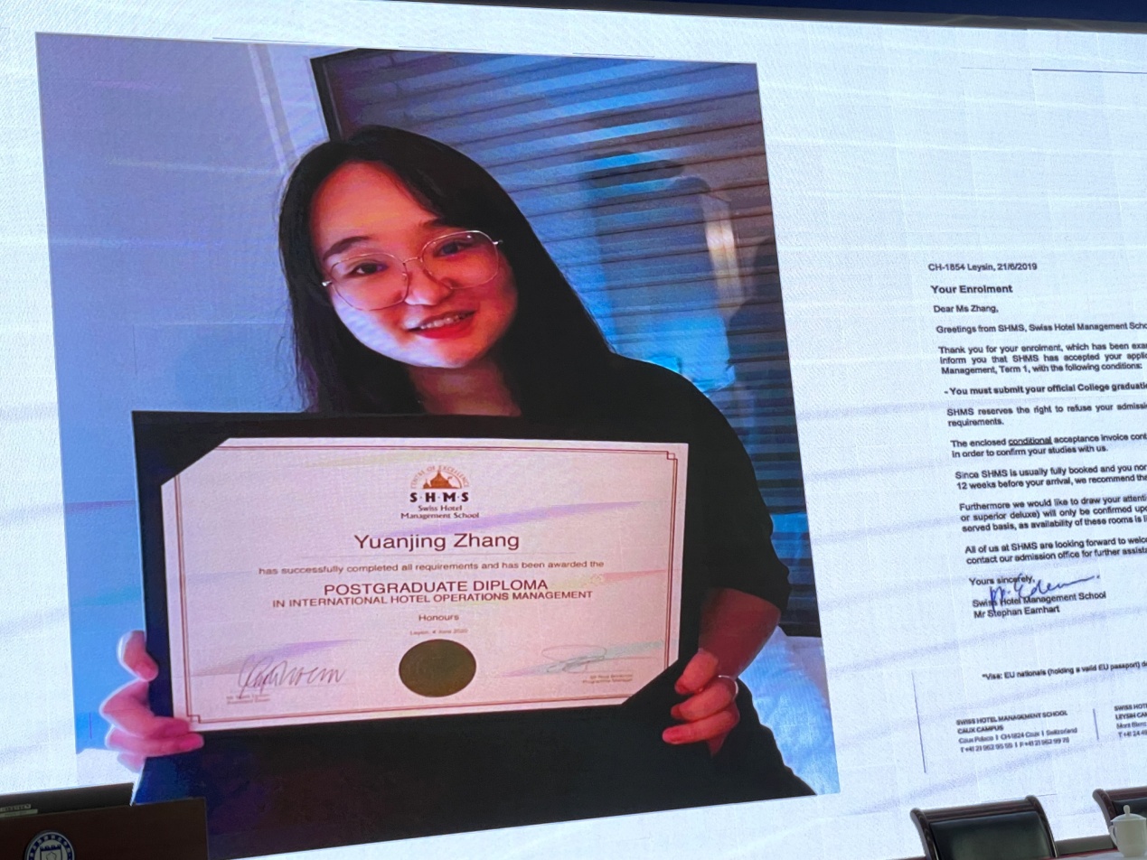 随后,SEG代表杨旻老师为同学们介绍了SEG下辖的四所大学的院系设置、课程设置、申请条件以及瑞士的留学生活等。参加该项目的学生的学位课程由瑞士SEG和南京旅游职业学院合作开展,在瑞士SEG下辖蒙特勒酒店工商管理大学学习,学制2年。按要求修满课程学分及完成2次环球带薪实习,毕业可获得HIM瑞士蒙特勒酒店工商管理大学及美国诺斯伍德大学的双学士学位。