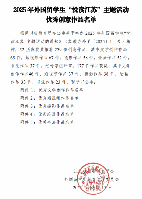 2025年12月10日,江苏省高等教育学会外国留学生教育管理委员会公布了江苏省2025年外国留学生“悦读江苏”主题活动优秀创意作品名单。在本次活动中,我院留学生表现优异,积极参与文学创作、绘画、短视频等多个赛道的作品评选,以独特的创新视角和出色的跨文化实践能力,展现出对江苏文化的深刻理解与感悟。