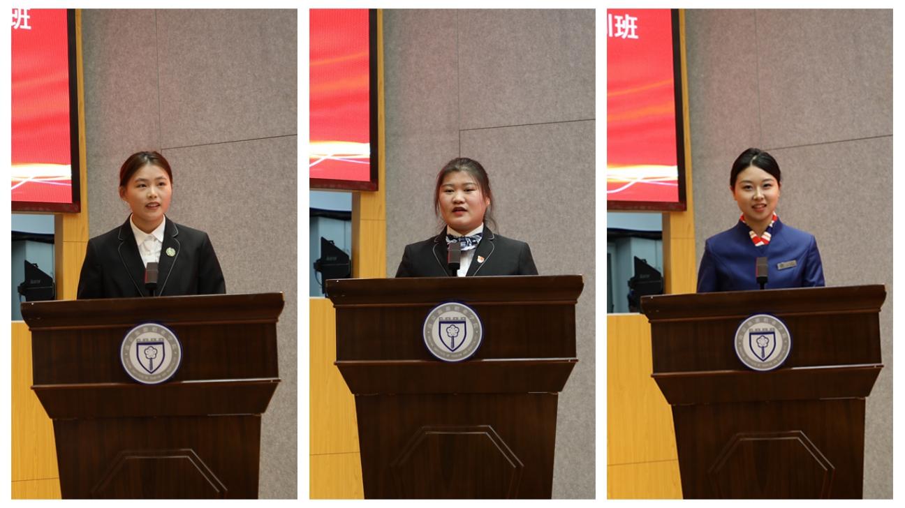 旅游外语学院22旅游英语1班丁姿文、烹饪与营养学院21级烹饪工艺与营养5班曹安丽、人文艺术学院23级空中乘务6班马丽三位同学分别作为2023年秋学期院党委党校优秀学员代表及2024年春学期院党委党校学员代表发言,他们表示将认真学习科学文化知识,不断提高政治理论修养,以最饱满的热情、最严谨的态度、最刻苦的精神投入到学习中,以实际行动回报组织的信任和期望。