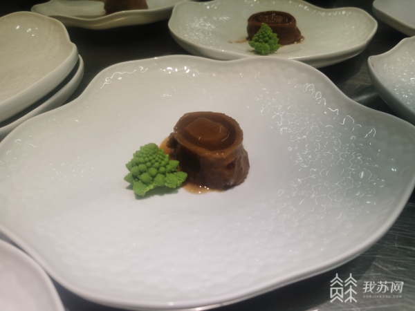 用白灵菇烹制8小时,加上宝塔菜,这道眼下最为火爆的素鲍鱼足够“以假乱真”。中国烹饪大师、南京旅游职业学院教授张荣春介绍说,“以前素鲍鱼我们都是用素鸡做的,现在我们都是用菌类来做。用白灵菇做的,它切开来以后,中间是弹性的,跟真鲍鱼一样。”