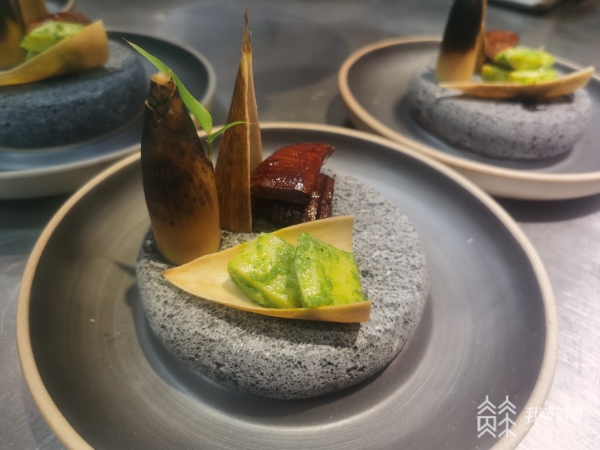 这道双味嫩笋解春风,以眼下应季的冬笋为原料,烹制出了两种完全不同的口味,色彩红绿搭配,色泽鲜艳。苏宁环球大酒店行政总厨武连杰介绍,“这个是我们传统的油焖春笋,但是今天我们创新了一下,在这个传统的基础上面,辅了一种新的类型,就是烟熏,另外我们做了一个藤椒味道的,两个交融搭配。”