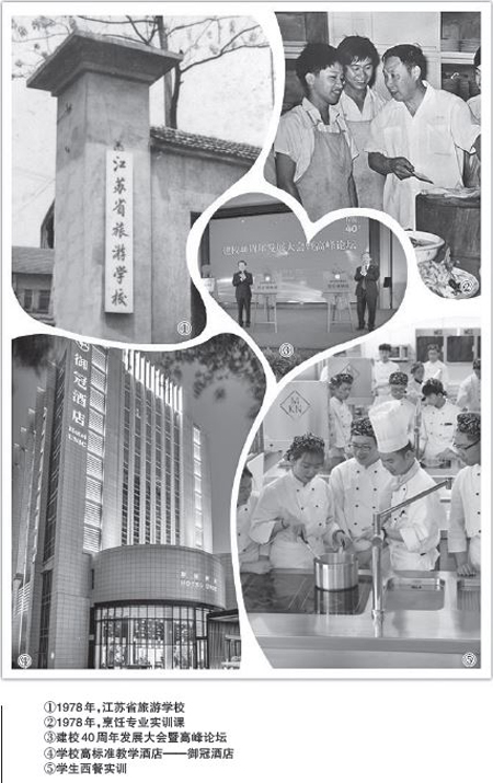 1978年改革开放春潮涌动,中国向世界敞开怀抱。国家提出“大力发展旅游事业”的战略,将旅游事业纳入国民经济之中,并定性为关系到国计民生的一项不可缺少的事业。为缓解当时旅游饭店服务、管理人才匮乏的状况,经江苏省政府部门批准,南京旅游职业学院前身、新中国首所培养旅游专业人才的学校——江苏省旅游学校在宜兴应运而生,中国旅游职业教育之轮由此启航。学校成立之初,校址设在废弃的苏州金山煤矿之上,条件十分艰苦。“每人半钵子米饭,常常不够吃,食堂没有凳子,8个人就围成一桌站着吃;学习条件也非常差,不少教材是教师自己编写的。”首届毕业生李靠山回忆当年的生活、学习情景,说起来仍历历在目。
