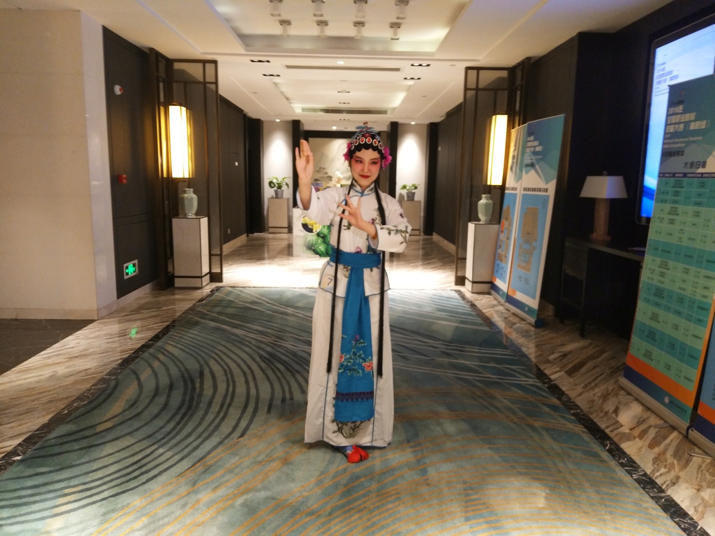 “陈杏元和番边关外,雪里冻出腊梅花儿开……”比赛门外的走廊中回荡着优美圆润的京剧唱腔,记者寻声而去,“还有一个小时才能到我,所以提前开嗓练习。”来自黑龙江职业学院的杨晔菡很早就精心准备好京剧扮相,她告诉记者,自己从小就喜欢京剧和二胡。“刚刚我唱的是花旦经典曲目《卖水》的片段,现在我正在模拟带领游客去中国戏曲博物馆的路上,借此机会传播中国国粹文化。”