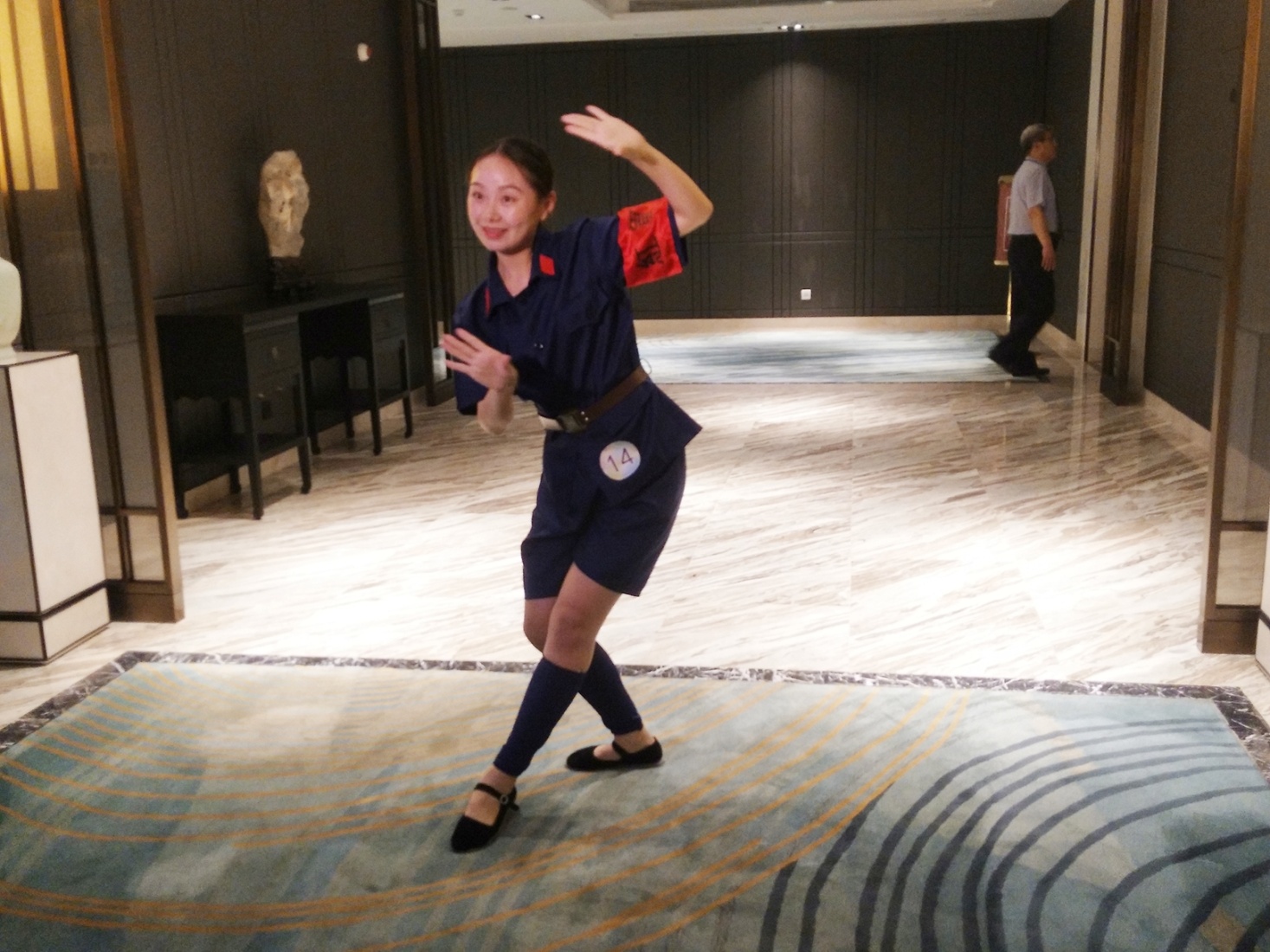 迎面走来一位青春活泼的姑娘,编着双马尾辫,一身电影《芳华》中的文艺兵打扮。“我叫赵杰,来自镇江市高等专科学校,专业是旅游英语。”为什么会喜欢《芳华》?“因为这个舞蹈表现出来的精神是我很喜欢的军队的样子。”赵杰非常大方,说着就给大家跳了一段。