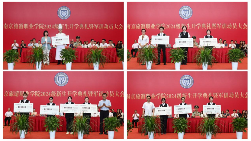 典礼上,学院领导为在2024年江苏省职业院校技能大赛、大学生创新大赛、全国首届大学生职业规划大赛中荣获一等奖和金奖的学生颁奖。其中,烹饪与营养学院学生韩宇航,在全国职业院校技能大赛及首届全国大学生职业规划大赛中荣获金奖,他对2024级新生寄语道:“南京旅游职业学院是一个非常好的成长平台,希望刚入学的你们能怀揣着憧憬与希望,在未来三年的学习生涯中,找到自己的方向,明确自己的定位,并坚持不懈地努力下去。”