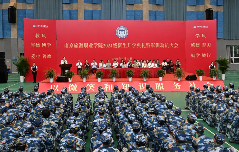 9月17日上午,2024级新生开学典礼暨军训动员大会在南京旅游职业学院体育馆举行。学院党委副书记、院长操阳,党委副书记朱琰,党委委员、副院长洪涛,党委委员、纪委书记、派驻监察专员金同胜,党委委员、副院长张骏,学院各职能部门、二级学院主要负责人,全体军训教官,2024级新生及其辅导员和班主任一同出席大会。开学典礼暨军训动员大会在庄严的国歌声中拉开帷幕。