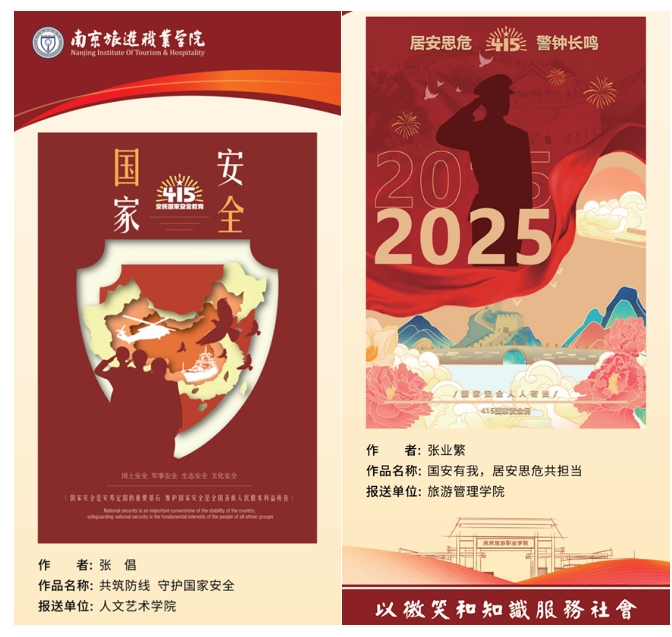 第十个国家安全教育日前夕,由党委宣传部主办的《2025年“415”第十个全民国家安全教育日主题海报展》在体育馆拉开帷幕。“这幅海报以中国地图为核心主图案,地图四周,和平鸽振翅翱翔,国防武器威武陈列,中国军队英姿飒爽、坚定守护”,海报展上,来自人文艺术学院工艺美术品设计专业的张倡作为海报设计者自豪地向参观师生娓娓道出设计理念及背后深藏的国安元素。海报展上展出的多件作品均由学生设计完成,同学们学以致用,立足总体国家安全观,聚焦政治安全、国土安全、军事安全等国家安全各个领域,将专业知识融入艺术创作,以新颖视角、精妙构思呈现多元国安元素,让前来参观的师生对国家安全知识有了更深的感悟。这是南旅院宣传国家安全知识的生动实践,也是创新形式推动法治宣传教育常态化、长效化的一次有益尝试。与此同时,国家安全教育主题宣讲比赛、国家安全线上答题竞赛以及主题班会等多种形式的教育活动也在南旅院如火如荼地进行,共同构建起全方位、多层次的国家安全法治教育体系,让国家安全教育在校园里落地生根、开花结果。