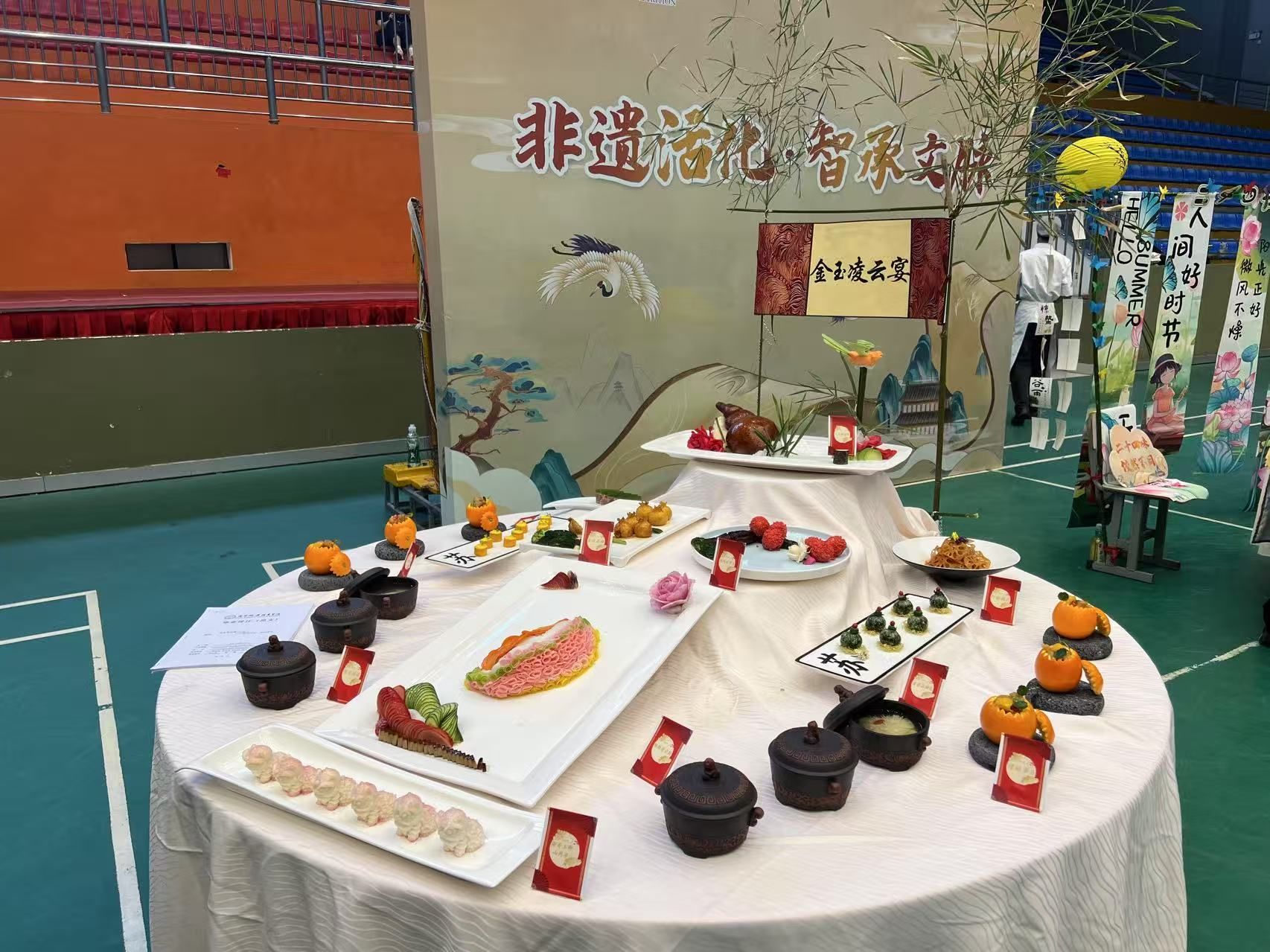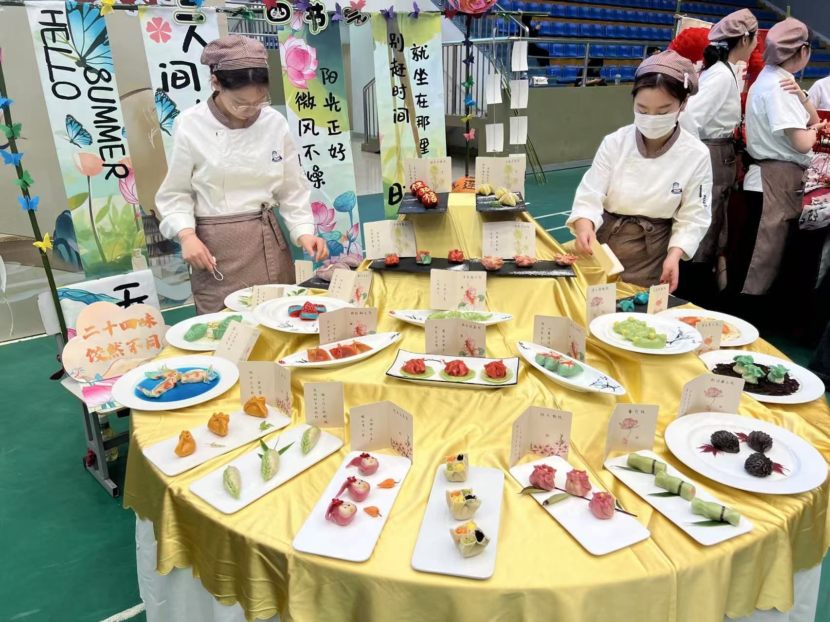 本次活动以“展、演、品、鉴”为主线,全方位呈现了2025届毕业生在非遗美食传承与创新方面的丰硕成果。主题新颖、造型美观的菜肴作品,传递了同学们在校三载的学习成果,其中《东坡雅宴》《三元风雅宴》等作品将传统工艺与现代技艺完美融合,令人耳目一新。在非遗技艺展演区,师生们精彩演绎了“豆腐雕牡丹”“金丝缠元宝”“奇巧西瓜盅”烹制技艺,通过精湛的刀工雕刻、精准的火候把控和独特的造型设计,生动诠释了传统技艺的精妙之处与创新活力。
