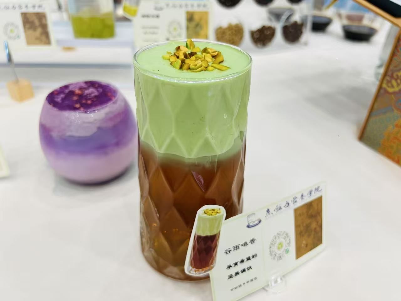 当坚果和咖啡相遇,交织出自然馈赠的浓郁芬芳,“谷雨咖香”调制而成;当黄瓜和咖啡跨界,“夏立咖影”惊艳亮相……面前一款款色泽鲜亮、味道香醇的饮品令人眼前一亮。“我们这个系列是以二十四节气为时空框架,聚焦咖啡调饮这一新兴消费市场,探索传统文化符号在当代饮品设计中的融合创新研究。”烹饪与营养学院22咖啡烘焙专项班陈妍告诉记者,她们的“廿四候 中国色”主题饮品还藏着助力三农的温暖故事,“制作这个系列的饮品,我们特地挑选了12款风味的云南保山小粒咖啡,保山小粒咖啡产业的发展可以为当地农民提供更多的就业机会和收入来源,帮助农民增收致富,助力乡村振兴战略的实施。”