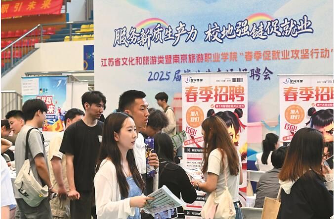 昨日,江苏省文化和旅游类二〇二五届毕业生专场招聘会在南京旅游职业学院举行,一百二十家省内知名文旅企业参会,涵盖酒店管理、旅游策划、数字营销、文化创意等领域,除餐饮、营销等传统岗位外,团播主播、运营设计、健康顾问等文旅新岗位为广大学子拓宽了职业赛道。