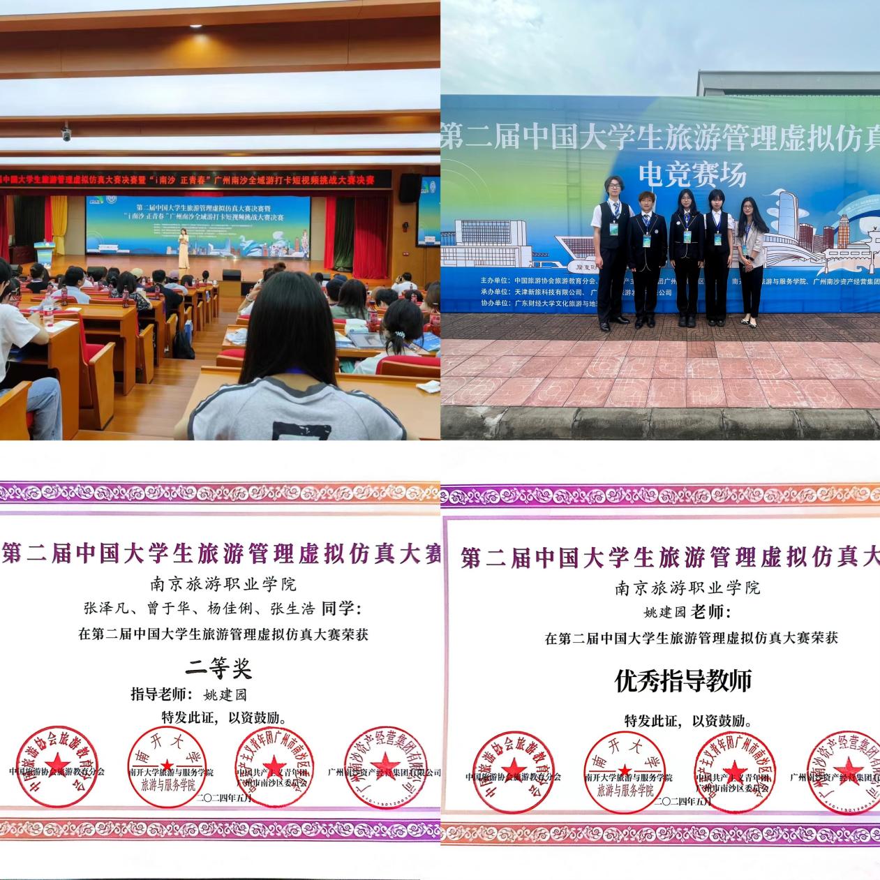 5月15日——19日,由中国旅游协会旅游教育分会、南开大学旅游与服务学院、中国共产主义青年团广州市南沙区委员会、广州南沙资产经营集团有限公司联合主办的第二届中国大学生旅游管理虚拟仿真大赛决赛在广州南沙区成功举办。我院由23民宿管理与运营1班张泽凡、张生浩、23酒店管理与数字化运营11班曾于华、22酒店管理与数字化运营3班杨佳俐四位同学组成的参赛团队在经过初赛、决赛的激烈竞争后,勇夺二等奖。姚建园老师获得“优秀指导教师”荣誉。