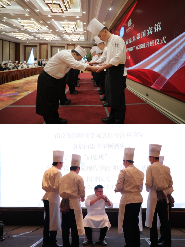 为深入贯彻党的二十大精神,积极推进职业教育高质量发展的实践步伐,进一步落实教育部办公厅印发《关于全面推进现代学徒制工作的通知》文件精神,2023年,南京旅游职业学院烹饪与营养学院与南京东郊国宾馆、南京丽思·卡尔顿酒店联合举办现代学徒制试点班并顺利结业。近日,我院第二届现代学徒制项目“现代学徒制·丽思班”和“现代学徒制·东郊班”于3月1日、3月12日顺利开班。