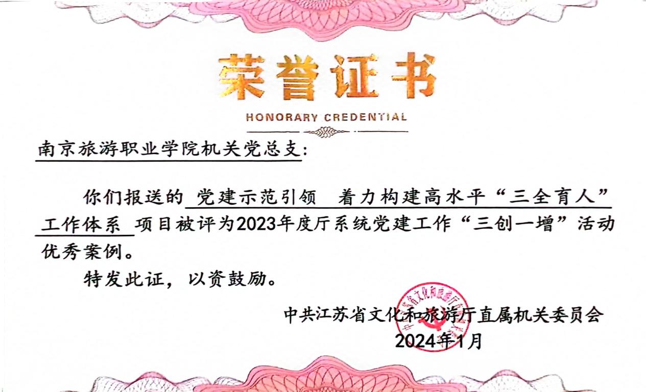 机关党总支“党建示范引领 着力构建高水平‘三全育人’工作体系”项目获评2023年度江苏省文化和旅游厅系统“三创一增”活动优秀案例。