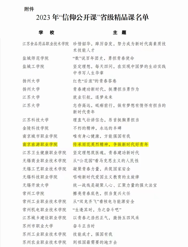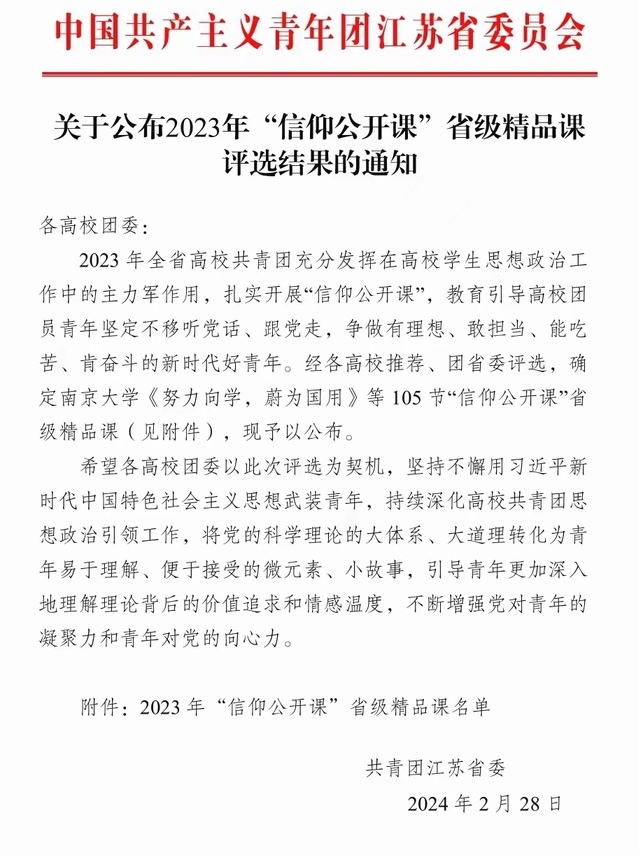 近日,共青团江苏省委公布了2023年“信仰公开课”省级精品课评选结果,全省共评出105节“信仰公开课”省级精品课。由我院团委、人文艺术学院团总支联合出品的《传承雨花英烈精神争做新时代好青年》获评省级精品示范课。