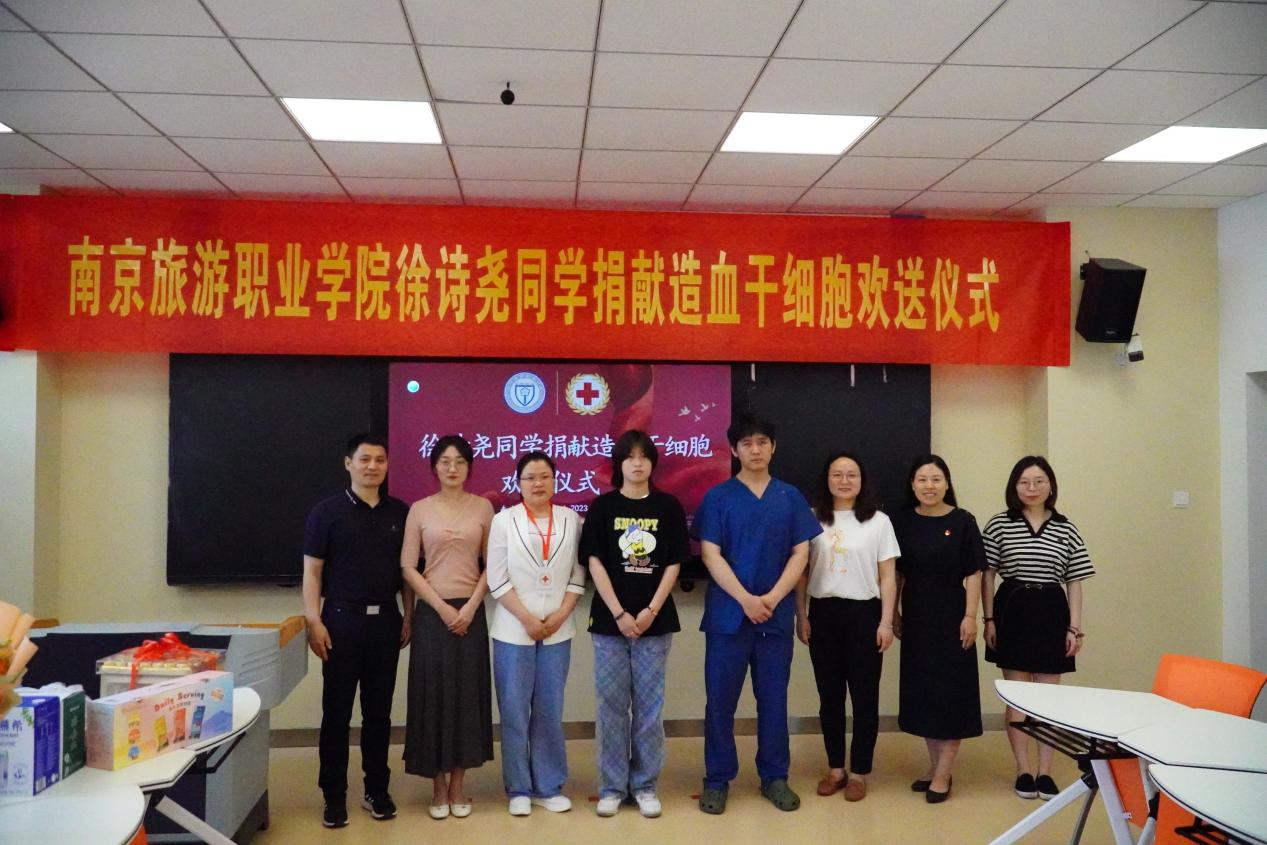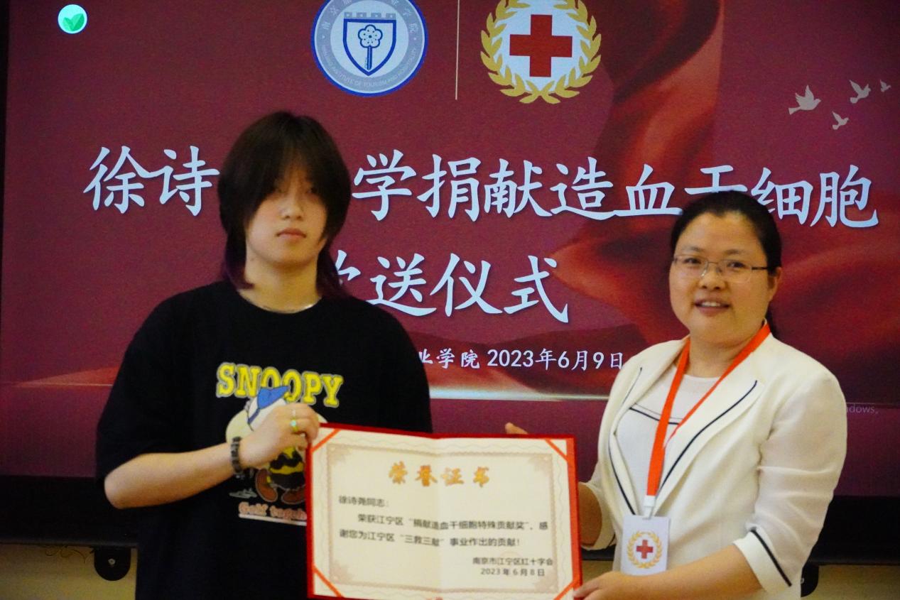 江宁区红十字会工作人员向学校一行详细介绍了造血干细胞捐献流程,在感谢徐诗尧同学为患者带来希望的同时,也特别感谢学校的培养和支持。徐诗尧捐献造血干细胞之前,江宁区红十字会和旅游管理学院专门为她举办了欢送仪式,江宁区红十字会常务副会长吕华为徐诗尧同学颁发了江宁区捐献造血干细胞特殊贡献奖荣誉证书。