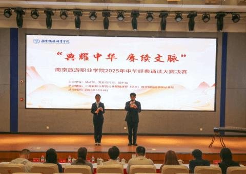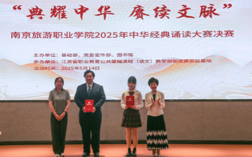 为深入贯彻落实全国、全省教育大会精神和《教育强国建设规划纲要(2024—2035年)》有关要求,加大国家通用语言文字推广力度,传承弘扬中华优秀语言文化,提升广大青年的语言文字应用能力和语言文化素养,由教务处、党委宣传部、基础部、图书馆主办,江苏省职业教育公共基础课程(语文)教学创新提质实验基地承办的南京旅游职业学院“典耀中华 赓续文脉”2025年中华经典诵读大赛决赛于5月14日在图书馆报告厅举行。学院党委委员、宣传部部长何晓岩,基础部主任朱丽、副主任仇涛出席活动,南京广播电视集团播音指导、江苏省广播电视协会播音与主持作品评审委员会专家委员化定杰,南京传媒学院播音主持艺术学教师、国家级普通话水平测试员、江苏省朗诵协会会员万强,南航金城学院艺术与传媒学院教师任俪濒以及江苏省职业教育公共基础课程(语文)教学创新提质实验基地副主任王爱荣,基础部教授吕胜男担任本场决赛专家评委。