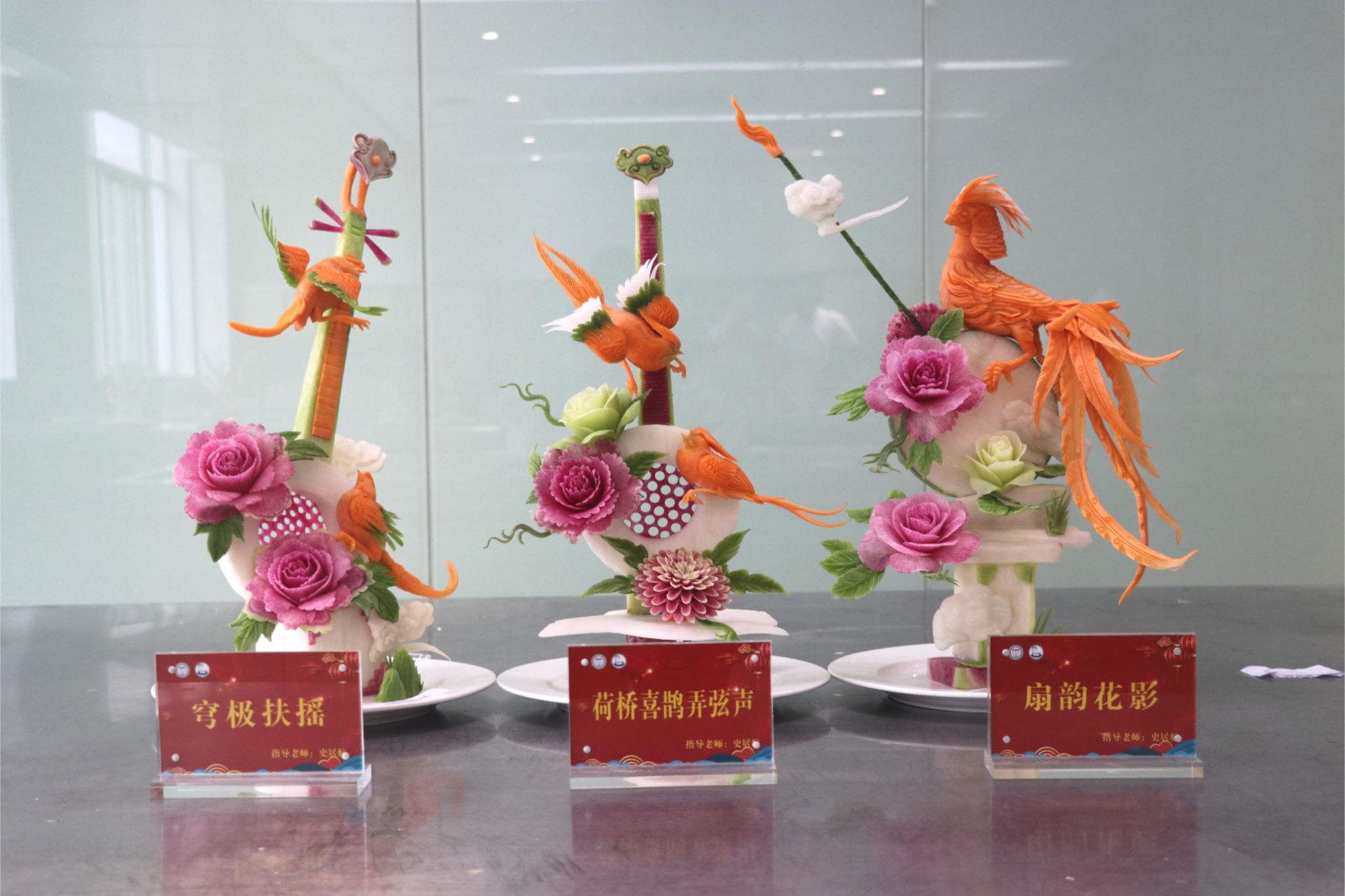 值得关注的是,大赛还融入思政教育元素。廉政主题创意雕刻与拼摆比赛中,选手以果蔬为原料,通过“莲花”“廉字”等造型传递廉洁文化;营养科普宣教演讲比赛则要求选手用中英双语普及 “吃动平衡”知识,将专业能力与社会责任有机结合,展现了固守“匠人品”的育人成效。