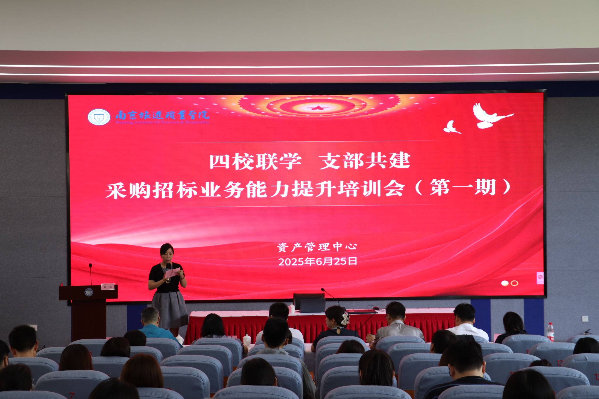 2025年6月25日,“四校联学 支部共建”——采购招标业务能力提升培训会(第一期)在我院教学楼报告厅顺利举办。学院党委委员、副院长杨斌,共建支部全体党员,江苏省招标中心培训团队以及我院采购招标联络员50余人参会。活动由机关党总支联合党支部书记戴丽主持。