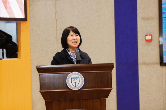 随后,万豪国际集团南京地区多位酒店总经理通过视频送上了对学子们的祝福,南京金丝利喜来登酒店总经理张卫东先生亲临现场寄语新生,他祝贺同学们入选领航班,并结合AI时代行业趋势,勉励同学们兼顾技术与人文素养,夯实英语与财会基础,努力成长为复合型酒旅人才,早日成为行业中坚力量。